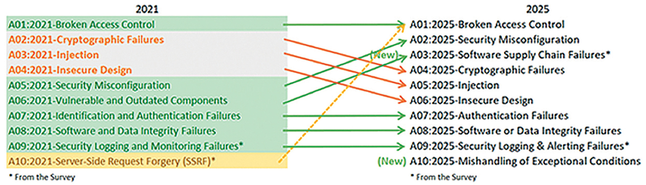 Novi dečki koji su uspjeli doći u Top 10 su Software Supply Chain Failure i Mishandling of Exceptional Conditions – a preraspodjelu starih i novih možete proučiti na slici 1.