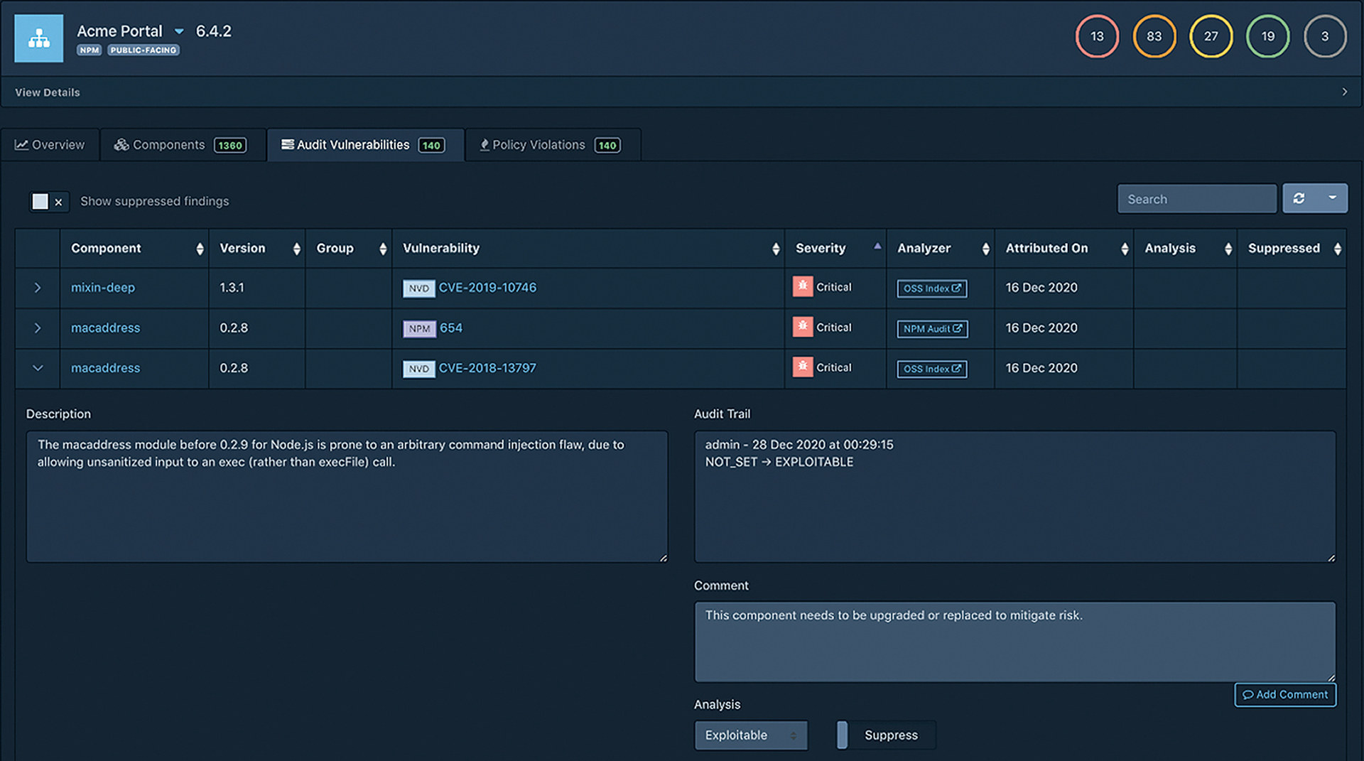 Slika 4. Jedna od nadzornih ploča gdje možete vidjeti učitane SBOM izvještaje. Između ostalog vidljiva je verzija (version) svake komponente, ranjivost (vulnerability), kritičnost (severity) i izvor (analyzer). Kako svaka ranjivost nije iskoristiva, već ovisi o kontekstu u kojem se nalazi, možete je evidentirati u polju za reviziju (audit trail). Izvor: https://dependencytrack.org/