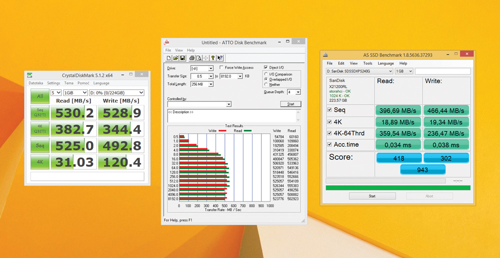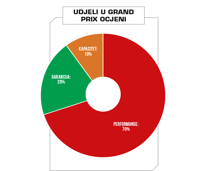 Mjerenje performansi odradili smo uz pomoć ukupno tri različita benchmarka za testiranja, a to su bili Crystal Disk Mark, ATTO i AS SSD, s udjelom u Grand Prix ocjenu od 70%. Uz pomoć njih smo odredili sve moguće mjerljive performanse koje su važne u ovakvoj usporedbi, počevši od sequential read / write performansi, preko mjerenja u manjim blokovima / sektorima te naravno IOPS-a. Crystal Disk Mark i AS SSD mjere performanse koristeći komprimirane podatke za testiranje dok ATTO koristi nekomprimirane. S ovim prvim, komprimiranim podacima, SSD-ovima je nešto teže baratati pa tako izmjerene brzine često znaju biti dosta niže od deklariranog. ATTO s druge strane izvlači ono najbolje iz SSD-ova koristeći nekomprimirane podatke za testiranje, pa tako njegovi rezultati često znaju biti daleko veći jer zapravo predstavljaju best case scenarij. Kao što ćete i vidjeti razlike u performansama i nisu toliko velike između modela, što je u neku ruku i dobra vijest za korisnike, jer čak i ako odaberete nešto jeftiniji disk imat ćete primjerak koji nije puno sporiji od top modela. Iako je ovo s jedne strane dobra stvar, s druge strane opet otežava konačni izbor, no o tome ćemo nešto kasnije.