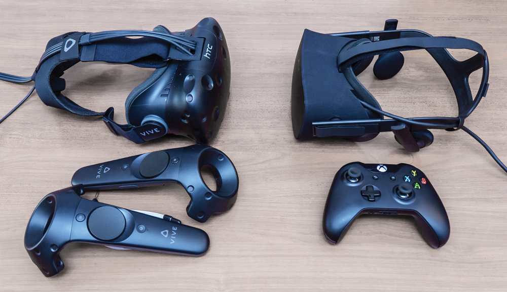Oculus Rift: Elegantan komad tehnike sa samo jednim kabelom na headsetu. Kabel se na svom kraju račva na dva nastavka/konektora koja morate prikopčati na PC - USB 3.0 i HDMI 1.3. U headsetu se nalaze dva 3,5-inčna OLED ekrana ukupne rezolucije 2160 x 1200 piksela (1080 x 1200 po oku/ekranu), s refresh rateom od 90 Hz te širine pogleda (FOV) od 110 stupnjeva. Dakle, gotovo identično Viveu, s tim da su ekrani malo manji pa je gustoća piksela na Oculus Riftu neznatno veća (456 ppi nasuprot Viveovih 447 ppi). Na headsetu se nalaze gumbi za podešavanje položaja leća i nevidljivi IR markeri prema kojima Constellation sustav za praćenje određuje poziciju headseta u prostoru