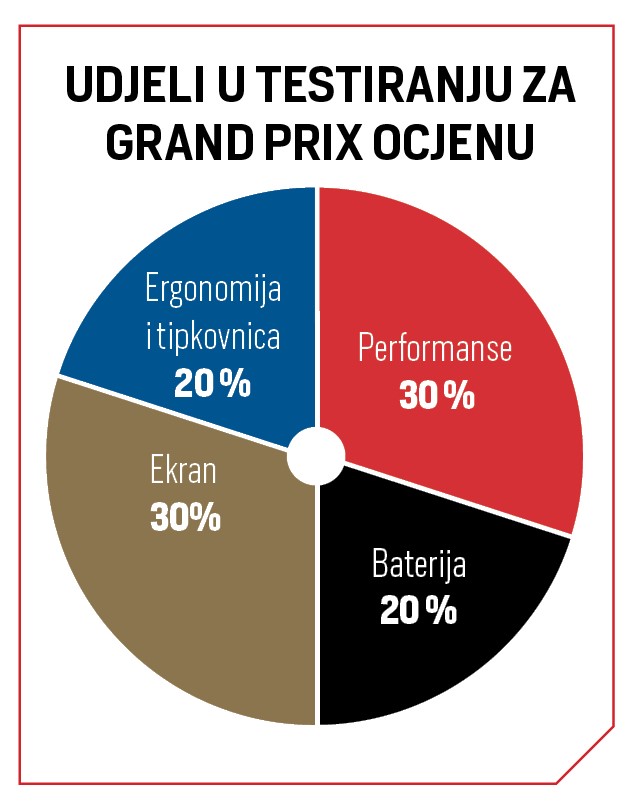 Za preciznije i objektivne brojke, iskoristili smo uobičajeni arsenal benchmark alata, no neke stvari nismo mogli objektivno mjeriti. Kvalitetu tipkovnice tj. ergonomiju ocjenjivali smo subjektivno, tipkajući postove po društvenim medijima u pauzi od tipkanja za ovaj broj časopisa. Ekran smo također ocjenjivali subjektivno, a jedina stavka za koju smo davali objektivni bonus je rezolucija. Full HD ekrani su, naravno, prošli nešto bolje nego HD ekrani. Ekrani s 1280 x 800, točnije jedan model s tim ekranom, dobio je i umanjenu ocjenu zbog rezolucije, unatoč odličnog kontrasta i touch panela.