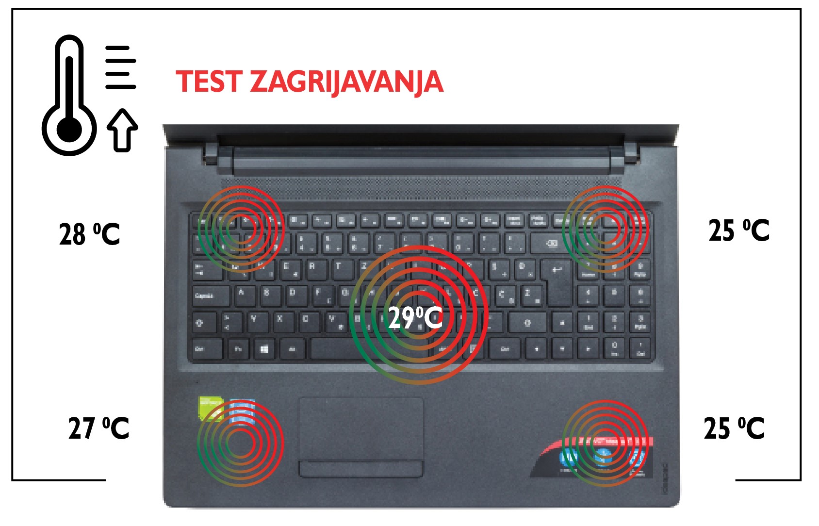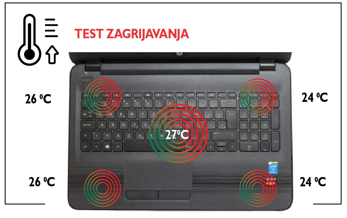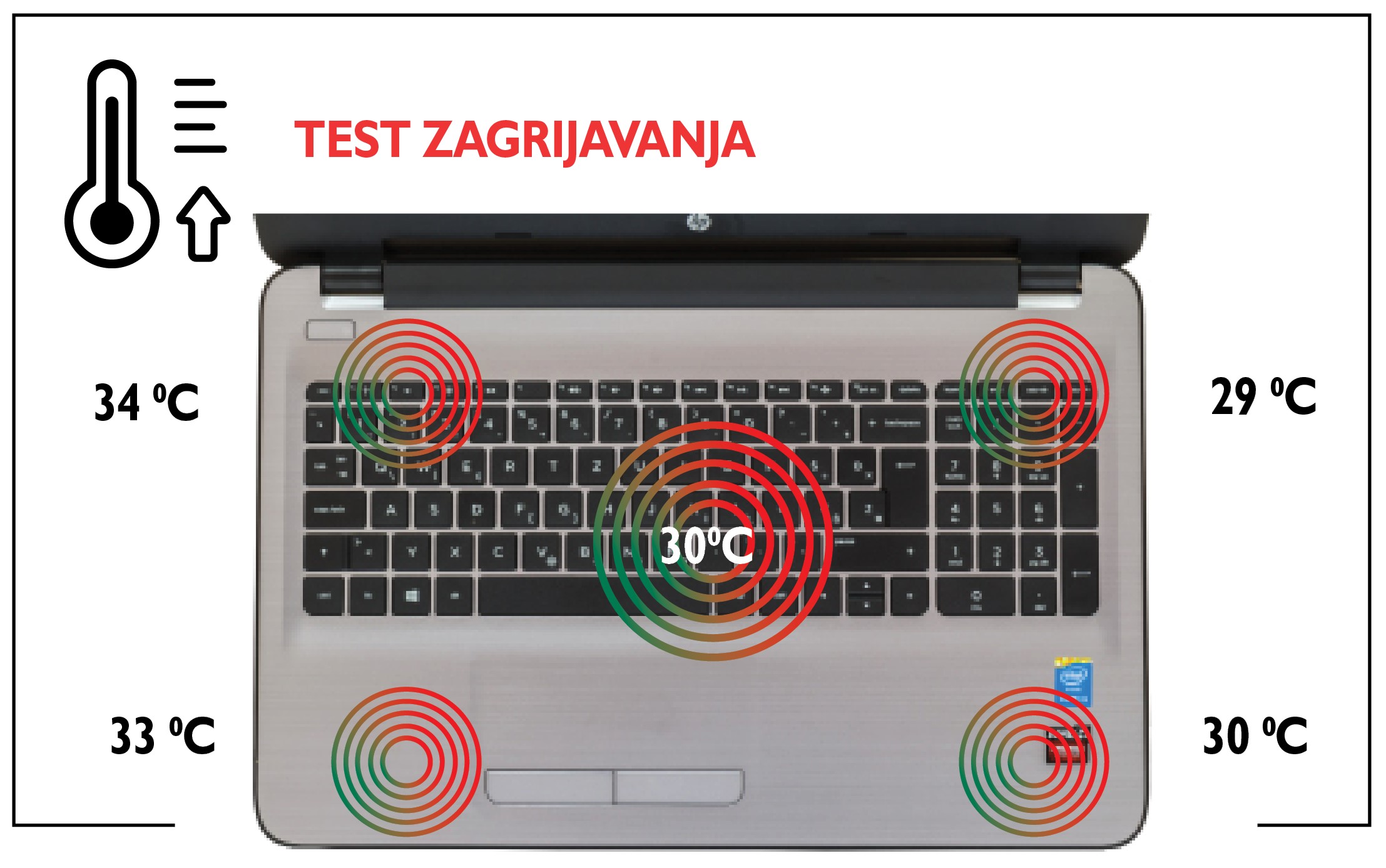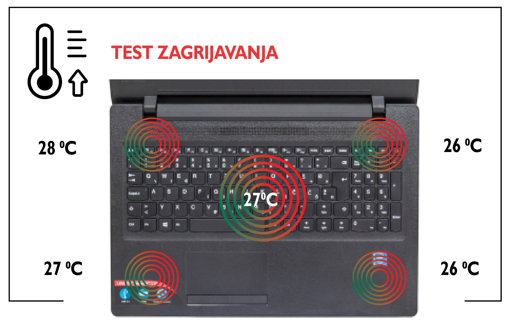 Tijekom cijelog testiranja iskoristili smo i laserski mjerač temperature te njime mjerili temperaturu na dodirnim površinama laptopa, na tipkovnici, trackpadu i na mjestima gdje odlažemo dlanove dok tipkamo sljedeći bestseller za koji nitko u obitelji ne zna.