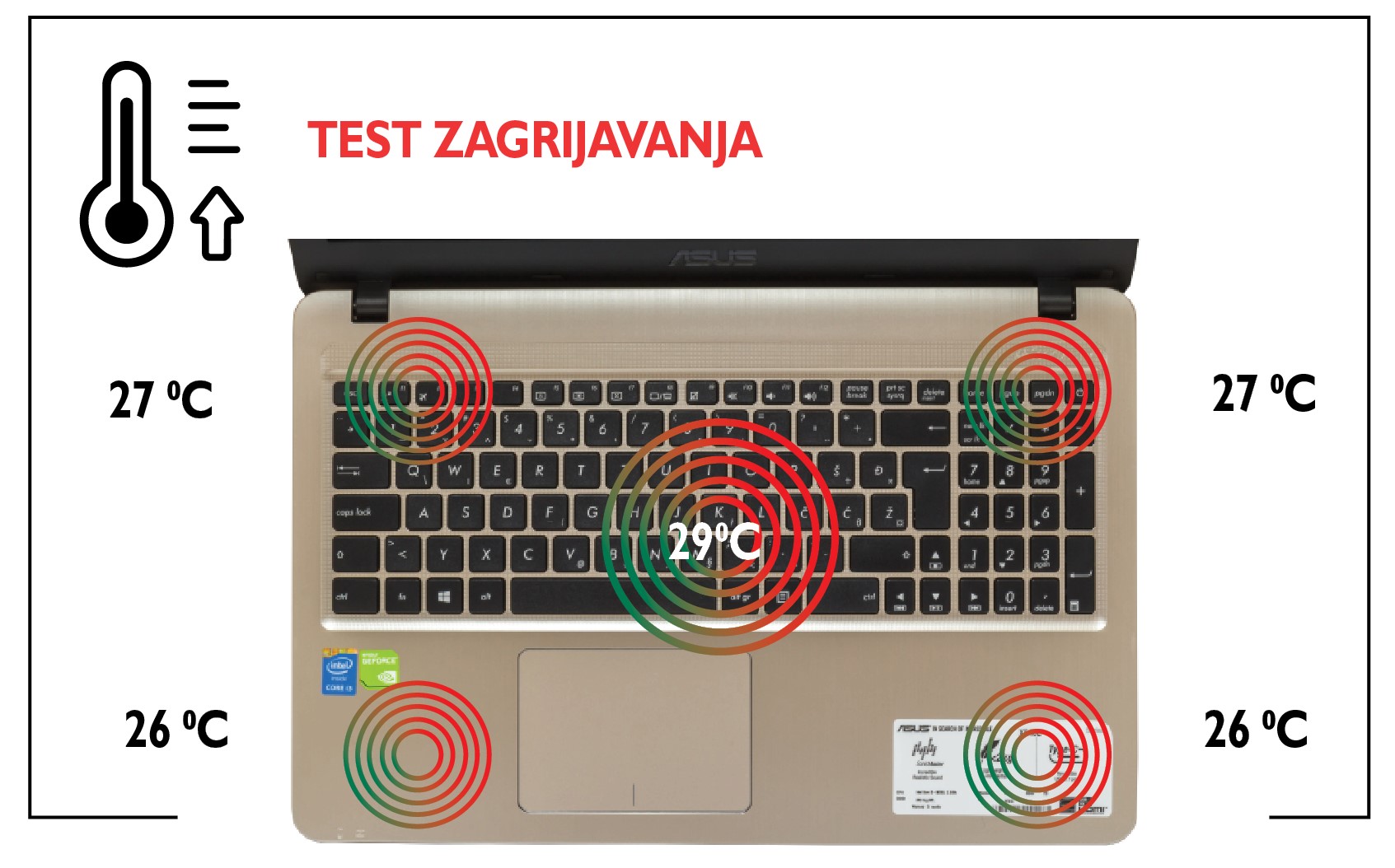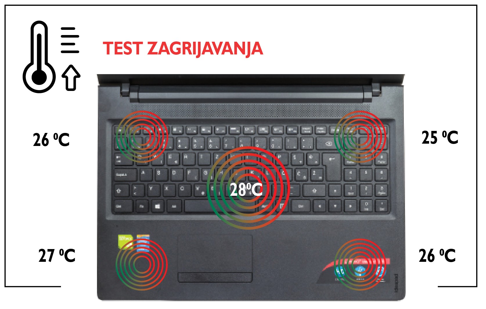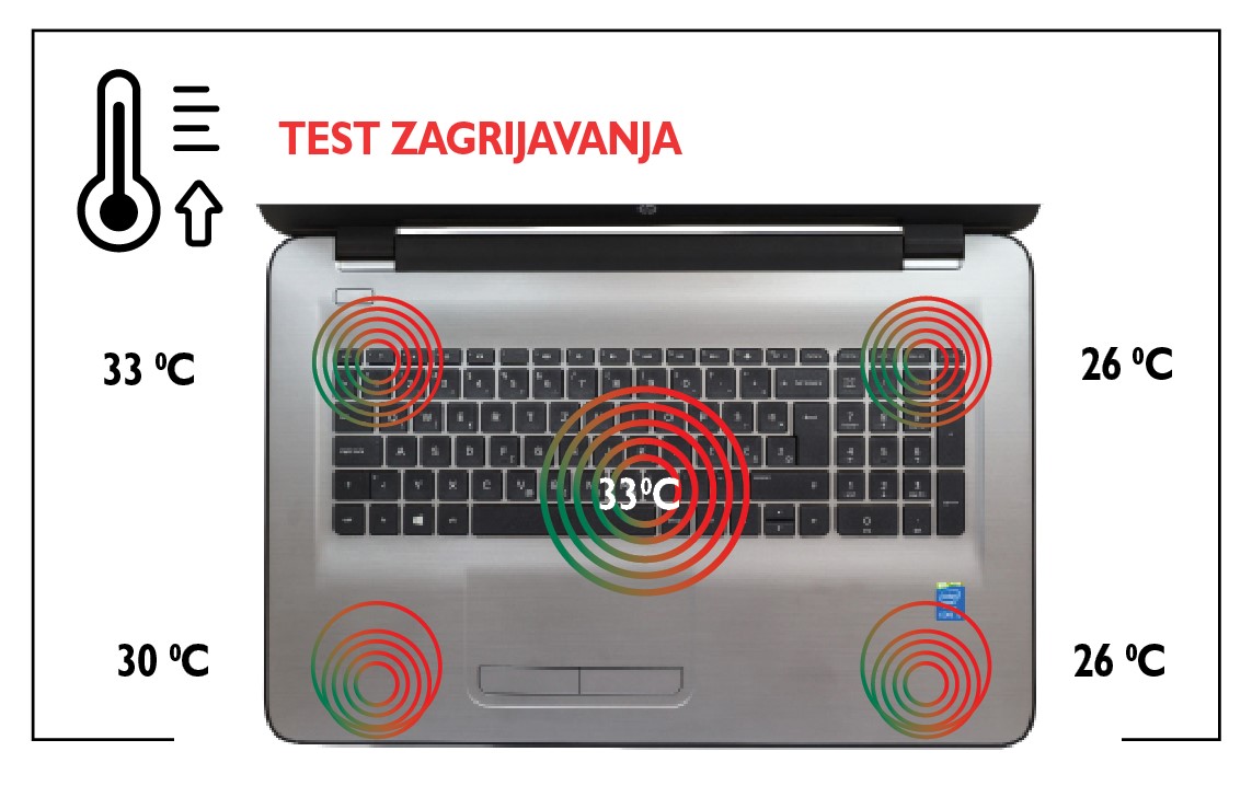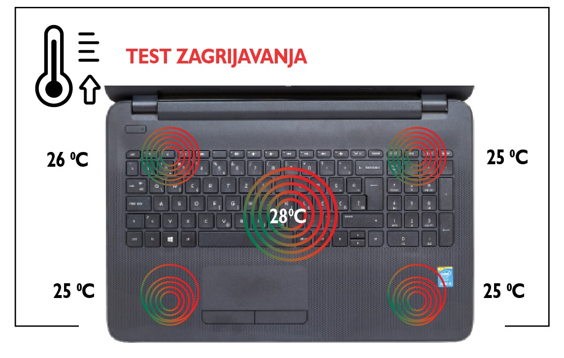 Tijekom cijelog testiranja iskoristili smo i laserski mjerač temperature te njime mjerili temperaturu na dodirnim površinama laptopa, na tipkovnici, trackpadu i na mjestima gdje odlažemo dlanove dok tipkamo sljedeći bestseller za koji nitko u obitelji ne zna.