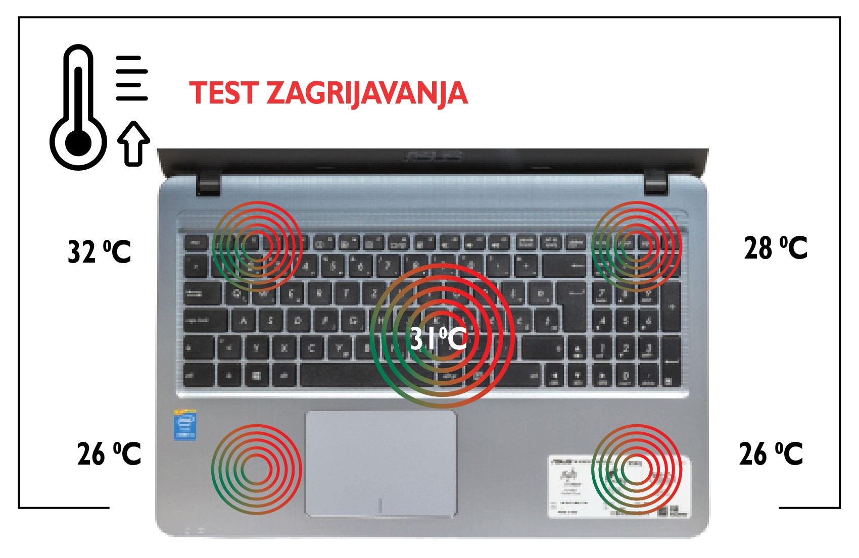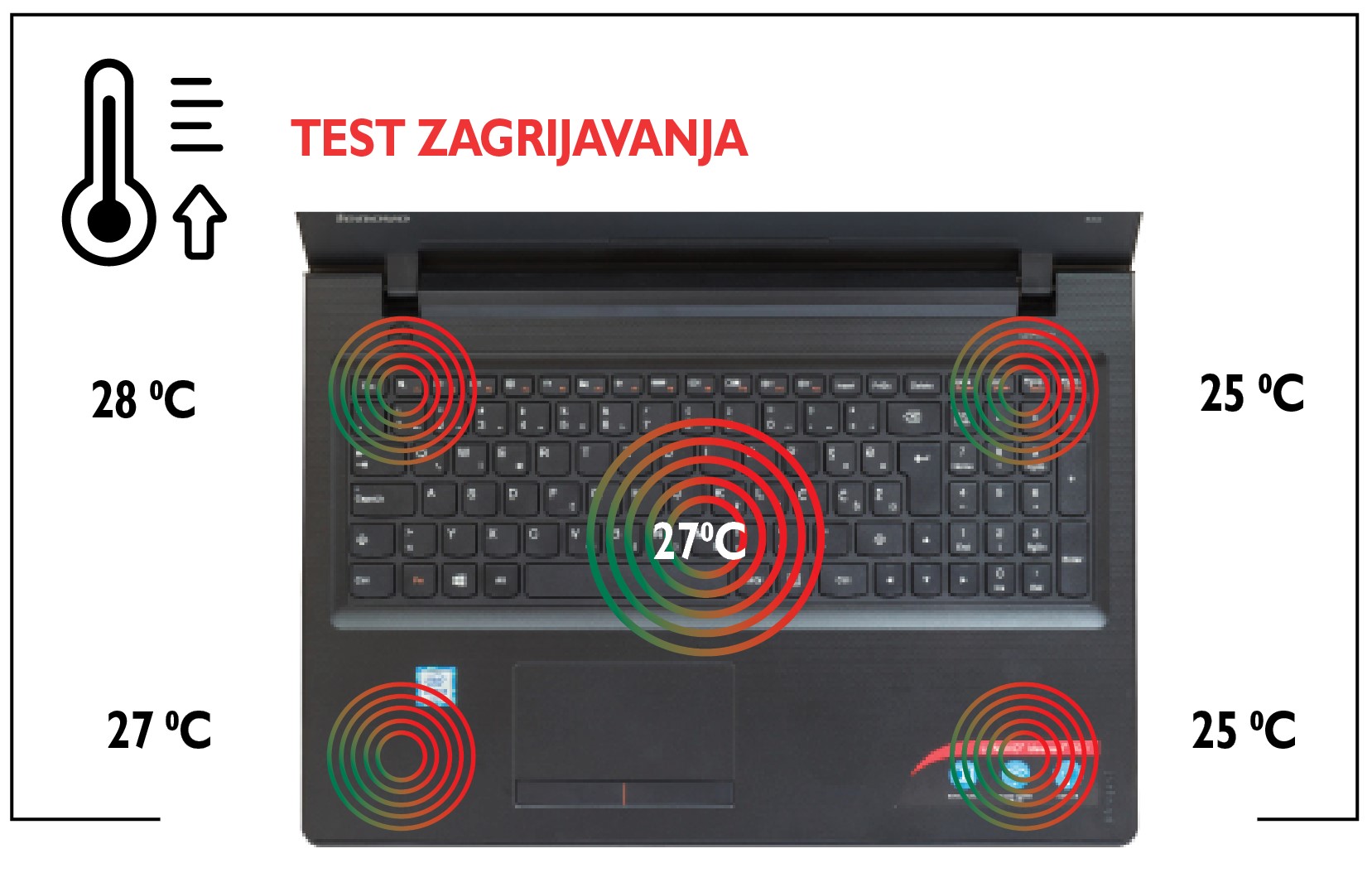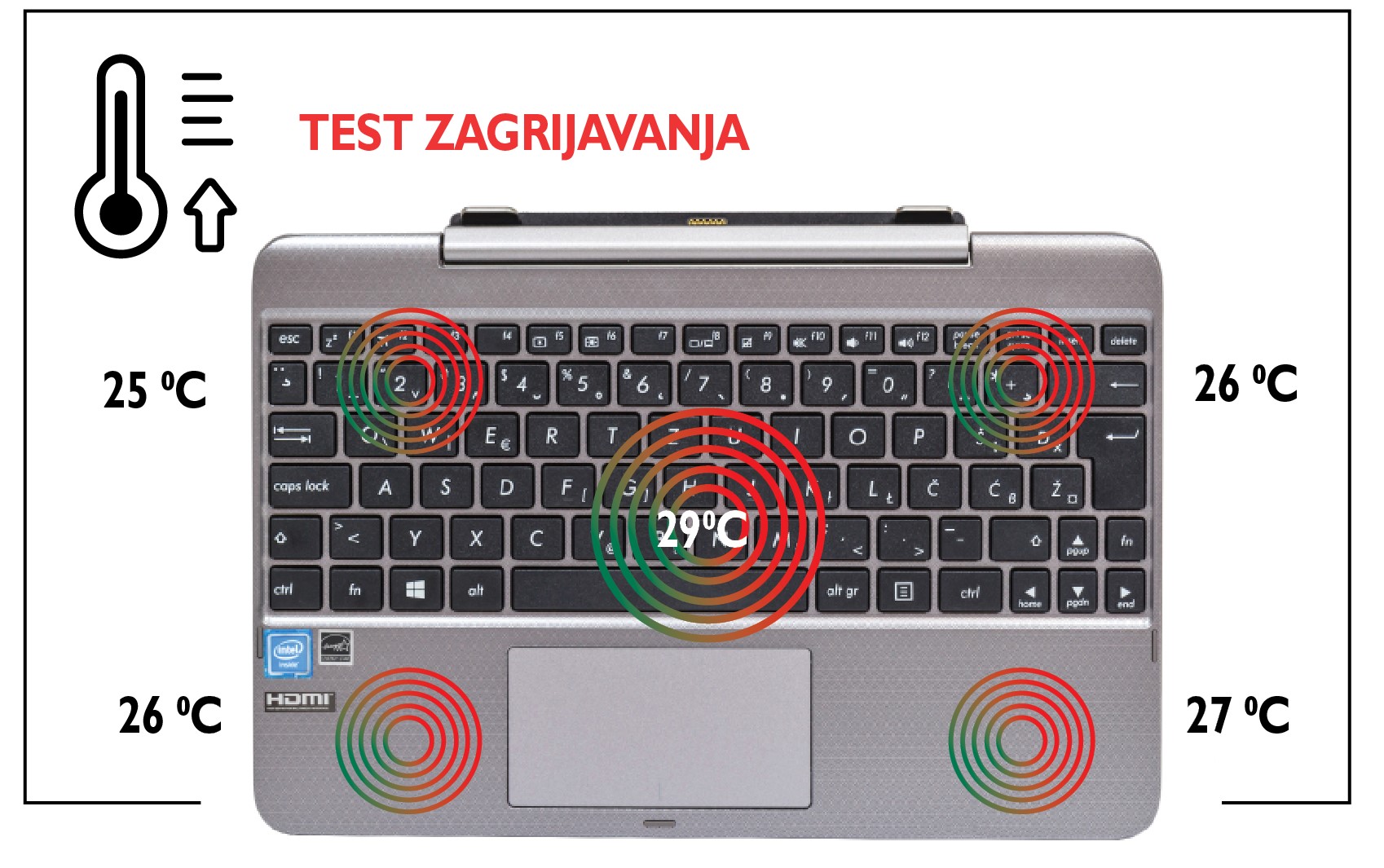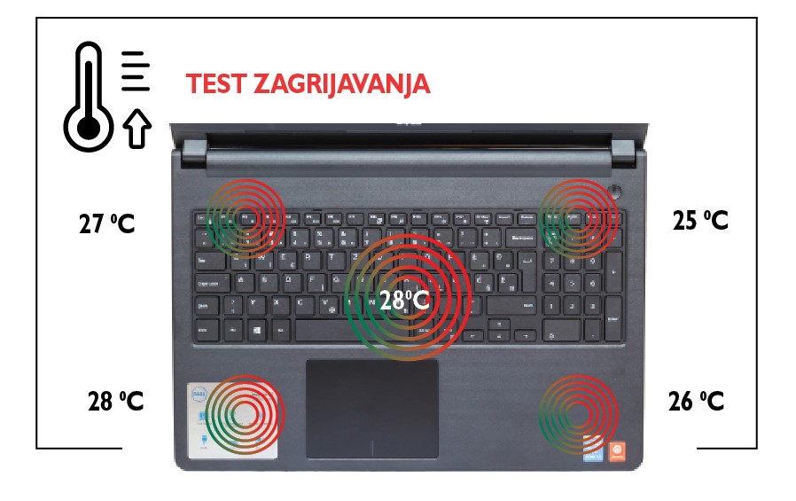 Tijekom cijelog testiranja iskoristili smo i laserski mjerač temperature te njime mjerili temperaturu na dodirnim površinama laptopa, na tipkovnici, trackpadu i na mjestima gdje odlažemo dlanove dok tipkamo sljedeći bestseller za koji nitko u obitelji ne zna.