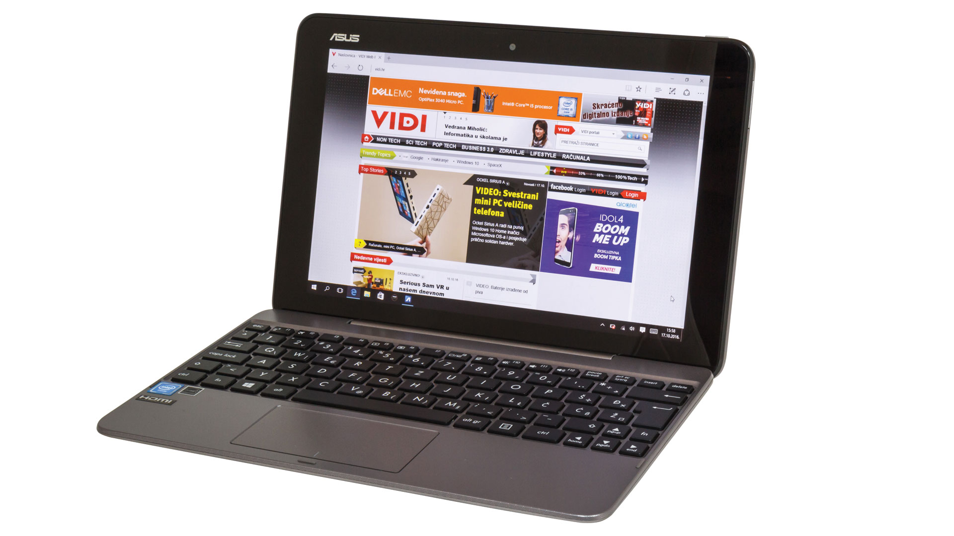 Windows 10 Home je predinstaliran, kako to već biva kod tableta, no ne dopada nam se niska rezolucija ekrana (1280 x 800) koju Asus pokušava nadoknaditi dobrim kontrastom i preciznim touchem. Budući da se sve interne komponente nalaze u gornjem, ekranskom, dijelu tableta, tipkovnica i touchpad su potpuno hladni te se zagrijavaju samo do naših dodira. Kad smo kod toga, tipkovnica je očekivano skučena, no nakon privikavanja i na njoj se može s lakoćom pisati budući da su tipke precizne i dobroga hoda. Isto se ne može reći za trackpad koji je jednostavno premalen. Oduševila nas je pak autonomija koja je i T101HA donijela relativno dobre ocjene na našem testu, unatoč uglavnom lošijim benchmark rezultatima.