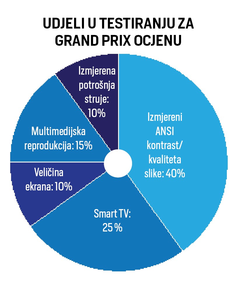Za izmjerenu potrošnju struje uzimali smo prosječnu vrijednost koja se pokazala na našem aparatu tijekom cijelog testa ANSI kontrasta (što uključuje i full white test), gledanja UHD videa i browsanja pametnim sučeljem. Dotičnu stavku smo bodovali s udjelom od 10 posto u konačnoj ocjeni. Preostalih 10 posto odlazi na veličinu ekrana koja je vrlo bitna na UHD modelima jer ovako visoka rezolucija dolazi do izražaja tek na većim dijagonalama.