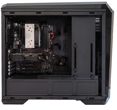 Prije nego zagrebemo u unutrašnjost Hangarove kante, par riječi i o njoj. Radi se o Chieftecovom kućištu za gaming, pri čemu mu je prostranost glavna odlika. U ovo kućište moguće je smjestiti i najveće gigante u svijetu grafičkih kartica. Odvojeni su prostori za napajanje, diskove i za matičnu, sa strane je plastična, djelomično prozirna stranica, a opremljeno je i LED osvjetljenjem.