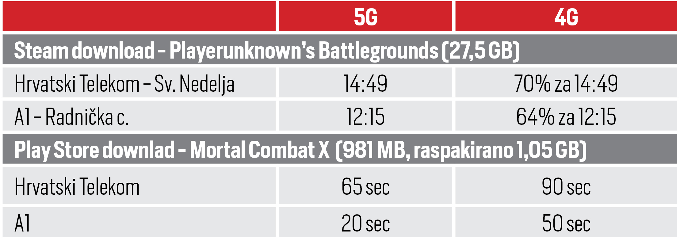 Isti test se na A1 mreži odvrtio za 20 sekundi, dok se na 4G mreži igra Mortal Combat X skinula za 50 sekundi. A1 vodi. Najvjerojatnije zbog integracije 4G i 5G, tj. Carrier Aggregation mogućnosti, koje na testu Hrvatskog Telekoma nismo imali, nego smo bili spojeni isključivo na 5G mrežu.