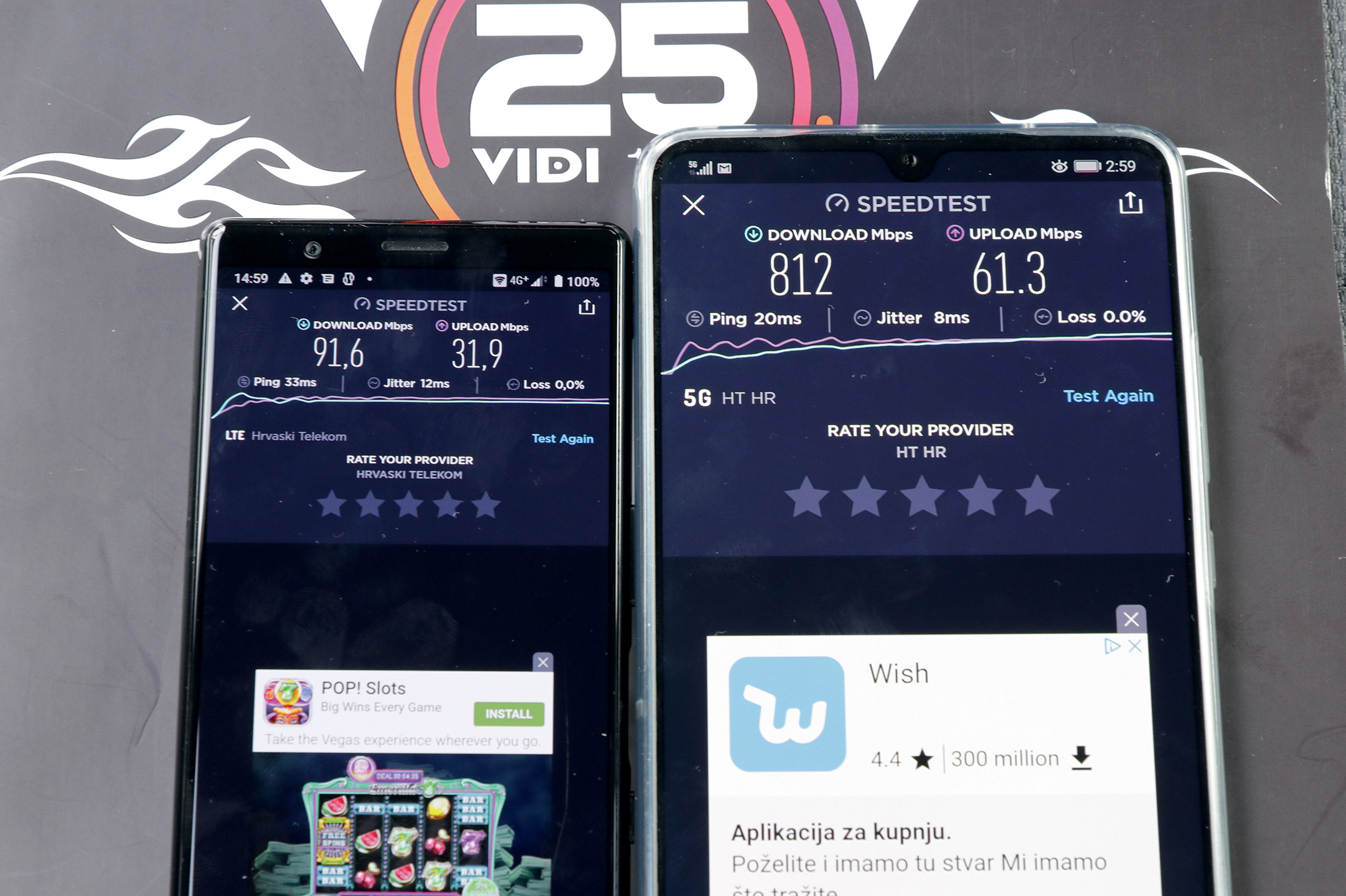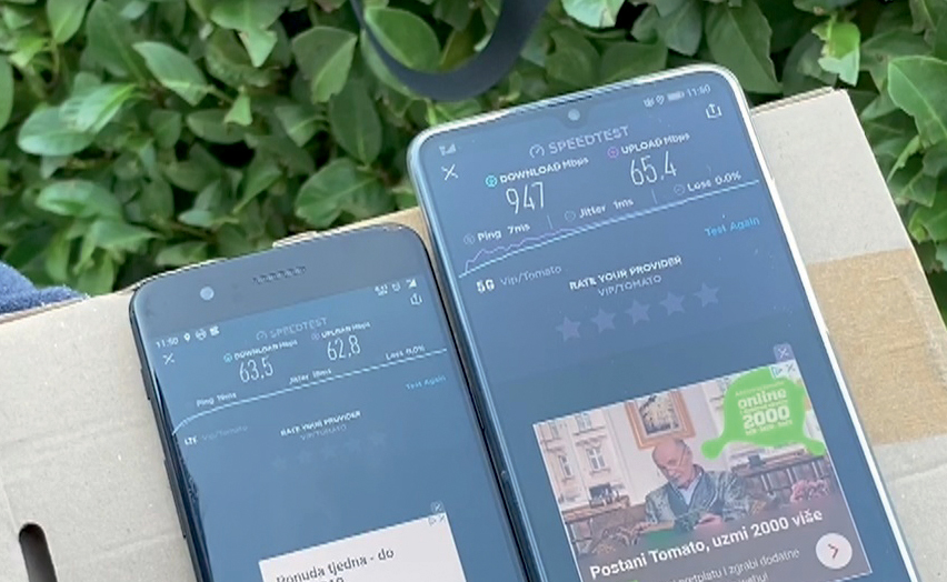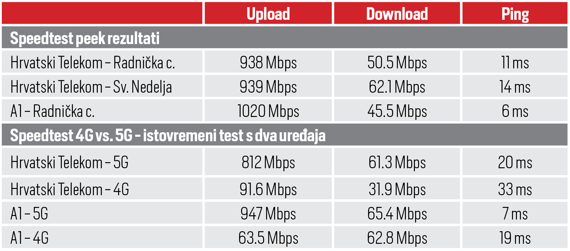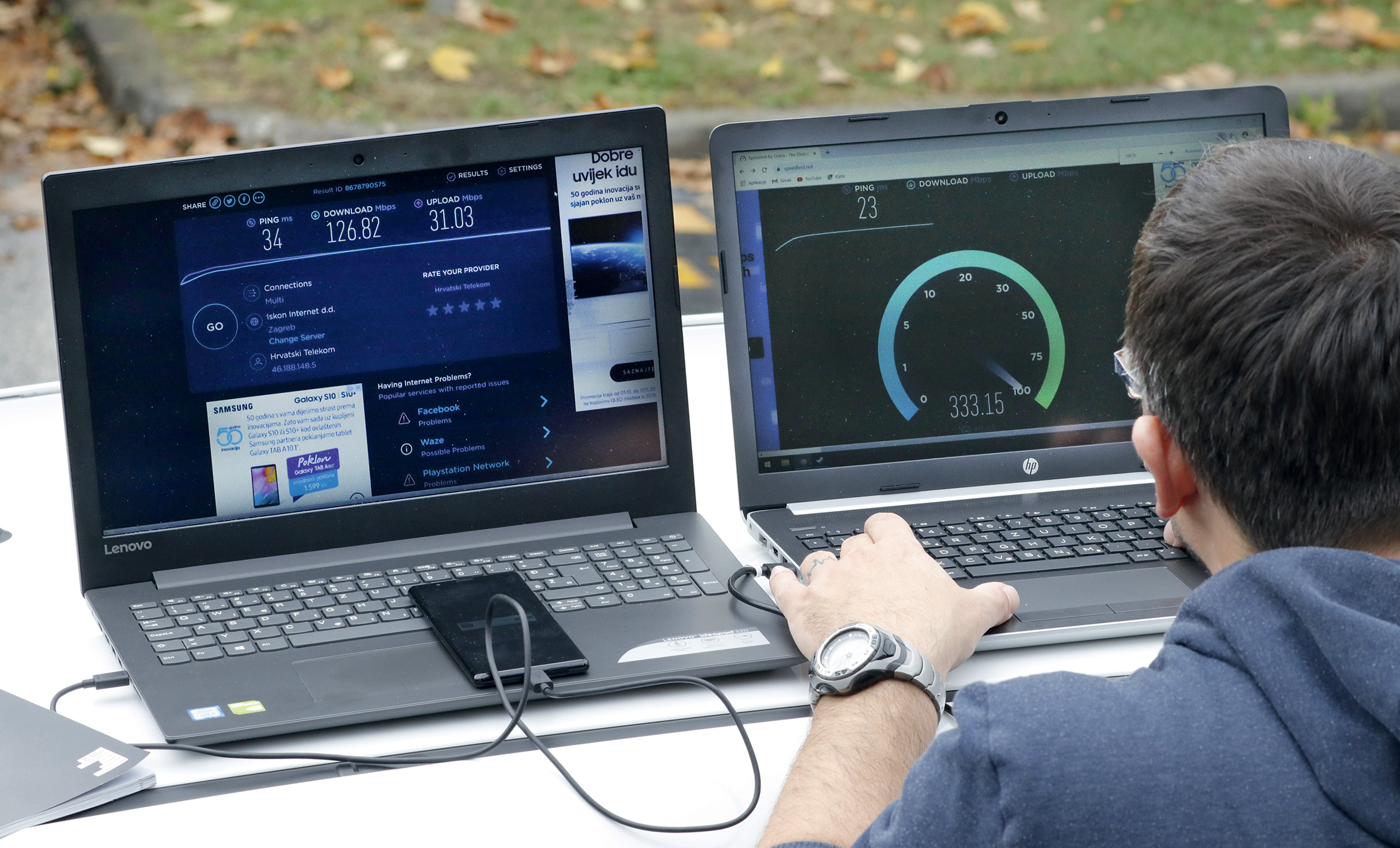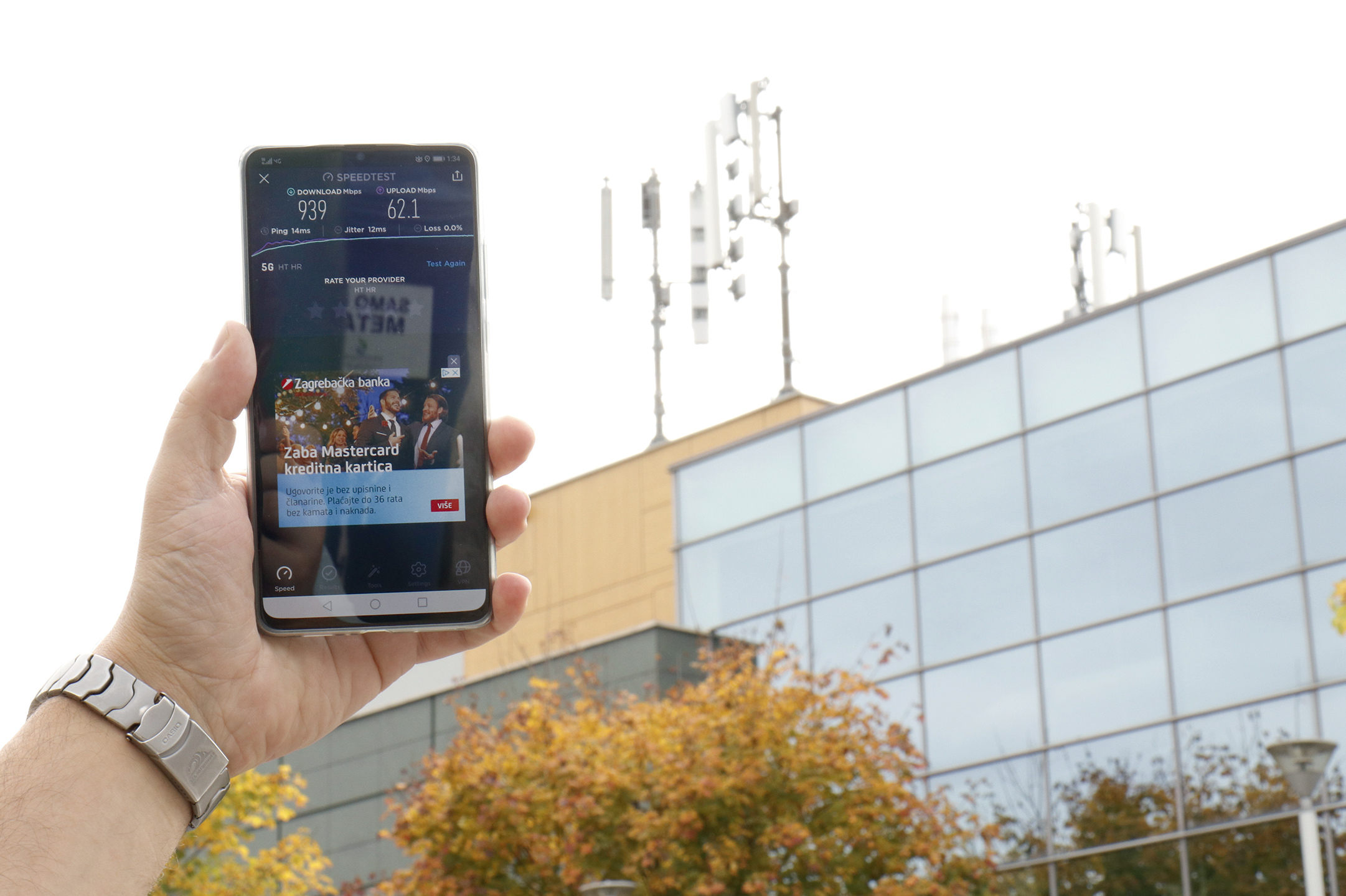 Na Radničkoj cesti kod zgrade Hrvatskog Telekoma, gdje se nalazi trenutno jedina 5G bazna stanica Hrvatskog Telekoma u Zagrebu, izmjerili smo propusnost mreže uz pomoć smartphonea Huawei Mate 20 x 5G te smo pored zgrade Hrvatskog Telekoma izmjerili brzine nešto veće od 800 Mbps. Udaljivši se dvjestotinjak metara od zgrade, gdje smo imali i bolju optičku vidljivost s 5G antenom na vrhu zgrade Hrvatskog Telekoma, izmjerili smo 926 Mbps uz ping od 19 ms.