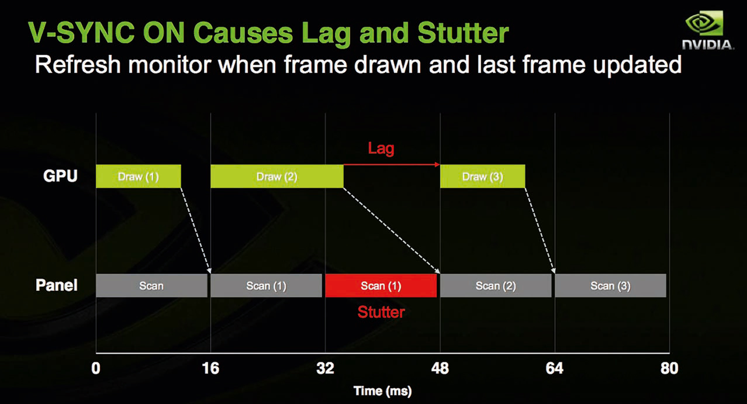 Nvidia se odlučila na dizajn i razvoj vlastite tehnologije pod nazivom GSync koja uključuje korištenje posebnog hardverskog modula odnosno čipa koji se ugrađuje u monitor. Ovakvo rješenje svakako je potencijalno tehnološki naprednije, ali su Gsync monitori iznimno skupi, te na taj način nisu osobito pristupačni većem broju korisnika.