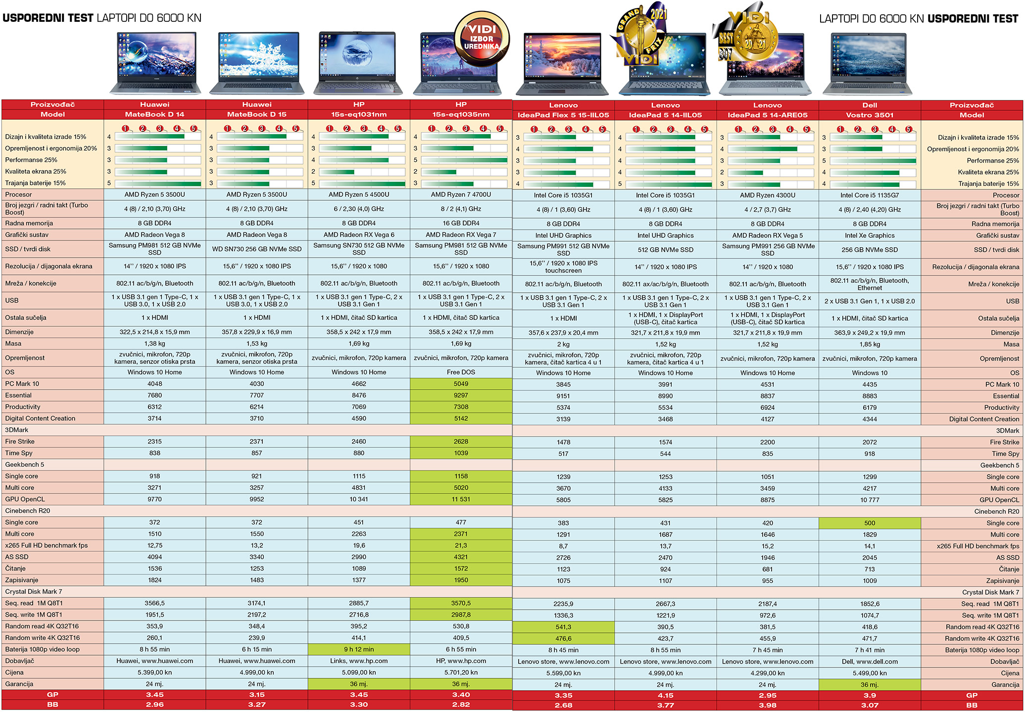 Na kraju recimo kako su ovim našim usporednim testom prodefilirali uobičajeni kandidati, što uključuje dobro poznate brandove u svijetu prijenosnih računala. Novost je, međutim, Huawei, čiji su mainstream prijenosnici odnedavno dostupni na domaćem tržištu. Huawei nam se predstavio cjenovno pristupačnim i vrlo atraktivno dizajniranim prijenosnicima solidnih performansi.