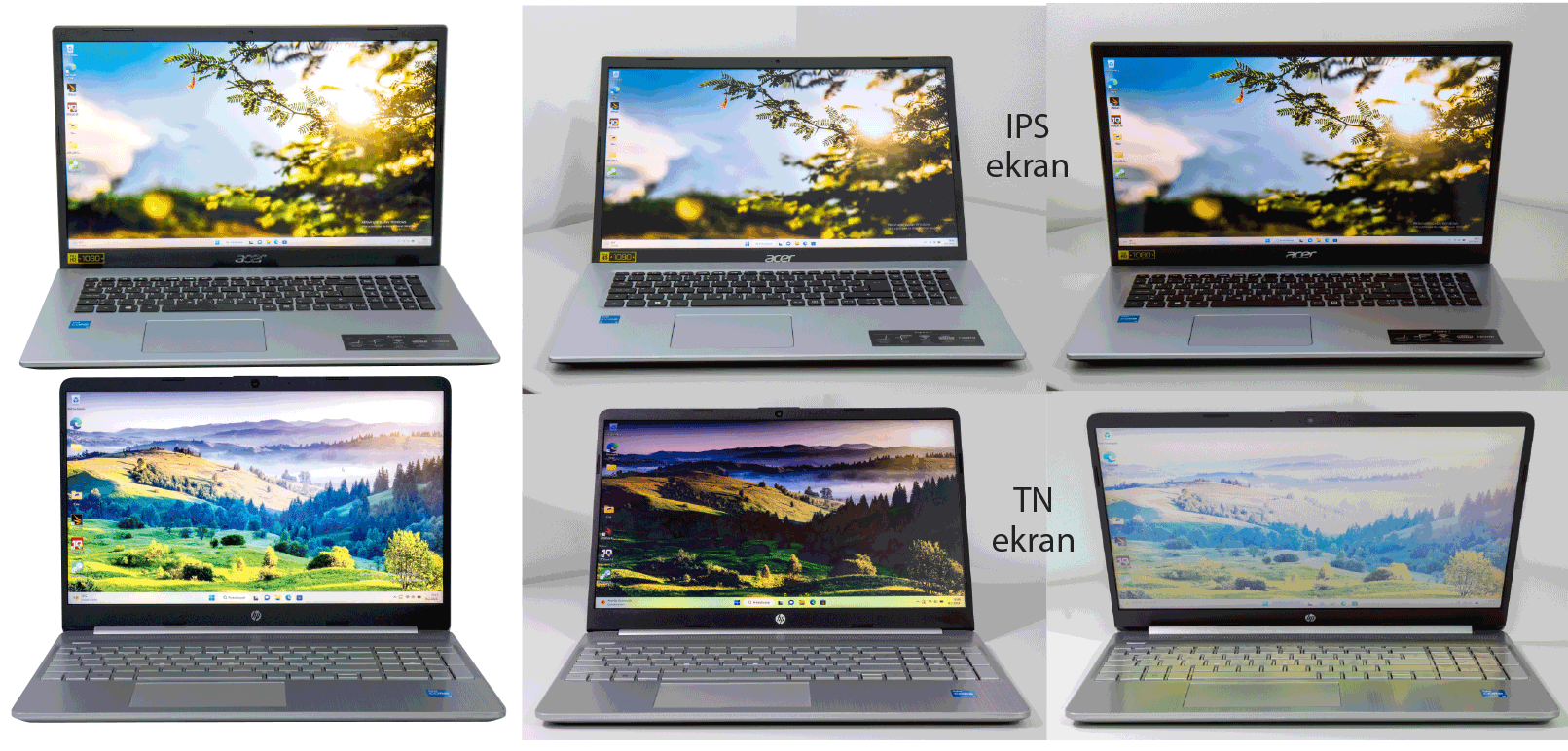 IPS vs TN: Gornji laptop ima IPS zaslon, a donji TN. Prva slika je očekivan izgled zaslona, a druge dvije pokazuju kako ga vidite pod laganim nagibom