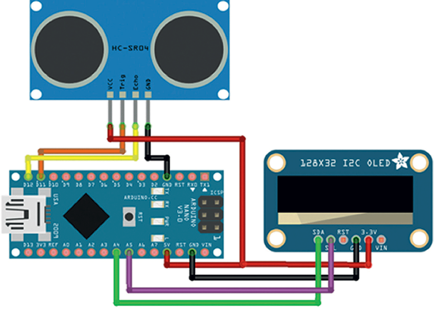 Od raznih senzora dostupnih na našem tržištu odabrali smo ultrazvučni senzor udaljenosti imena „hc-sr04“. Senzor ima maksimalnu udaljenost mjerenja od 4 m, ali navodno da se može povećati na 7 m korištenjem posebnih libraryja. Mi nismo isprobavali izvući maksimum jer smo bili zadovoljni i s 4 m. Kut mjerenja iznosi 15 stupnjeva, a preciznost nekakvih 1 cm. Senzor ima četiri priključka, dva su za napajanje od 5 V, dok su preostala dva za slanje i primanje impulsa. Ultrazvučni senzor je povoljan i može se kod nas kupiti po cijeni od 25 kn. Iako ima odstupanja pri većim udaljenostima i malo područje mjerenja, poslužit će nam pri izradi digitalnog mjerača udaljenosti. Želite li nešto precizniji uređaj s većim dometom, zaboravite na jeftine ultrazvučne senzore. Tada vam je potreban laserski senzor, koji je podosta skuplji. Cijene od tisuću kuna za laserski uređaj za mjerenje udaljenosti opravdane su vrhunskim senzorima i ostalim raznim mogućnostima.