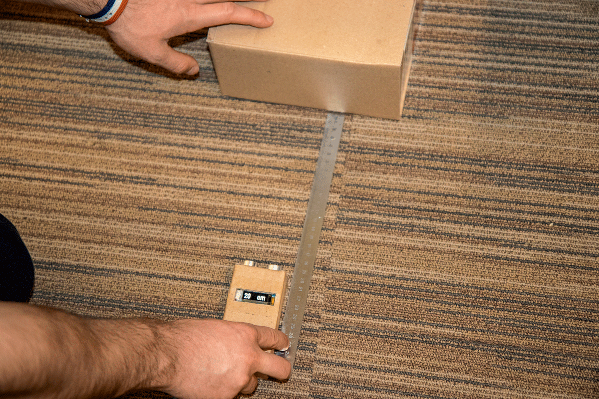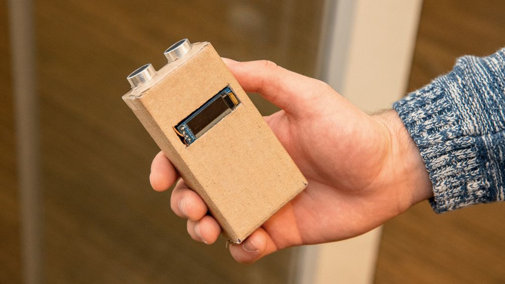 DIY projekti najčešće su napravljeni tek toliko da bi radili. Funkcionalnost je daleko ispred estetike, no ako imate vremena, možete se pozabaviti ljepšim kućištem od pleksiglasa ili ga možda čak isprintati uz pomoć 3D printera. Naše kućište je za prvu ruku napravljeno od kartona. Možda nije najbolji izbor, ali funkcionira! Dimenzijama 10 x 5 x 3 cm kućište je dovoljno malo da bi bilo praktično, a dovoljno veliko da bi unutar njega stali Arduino, ultrazvučni senzor, zaslon i baterijsko napajanje. Zbog ušteda dimenzija možda je bolje za napajanje koristiti bateriju od 9 V. Punjive litij-ionske baterije imaju nazivni napon od 3,7 V, koji nije dovoljan za napajanje Arduina i ultrazvučnog senzora, zato bismo morali koristiti step-up pretvarač. Ne želimo previše komplicirati, tako da ćemo se zadržati na bateriji od 9 V.