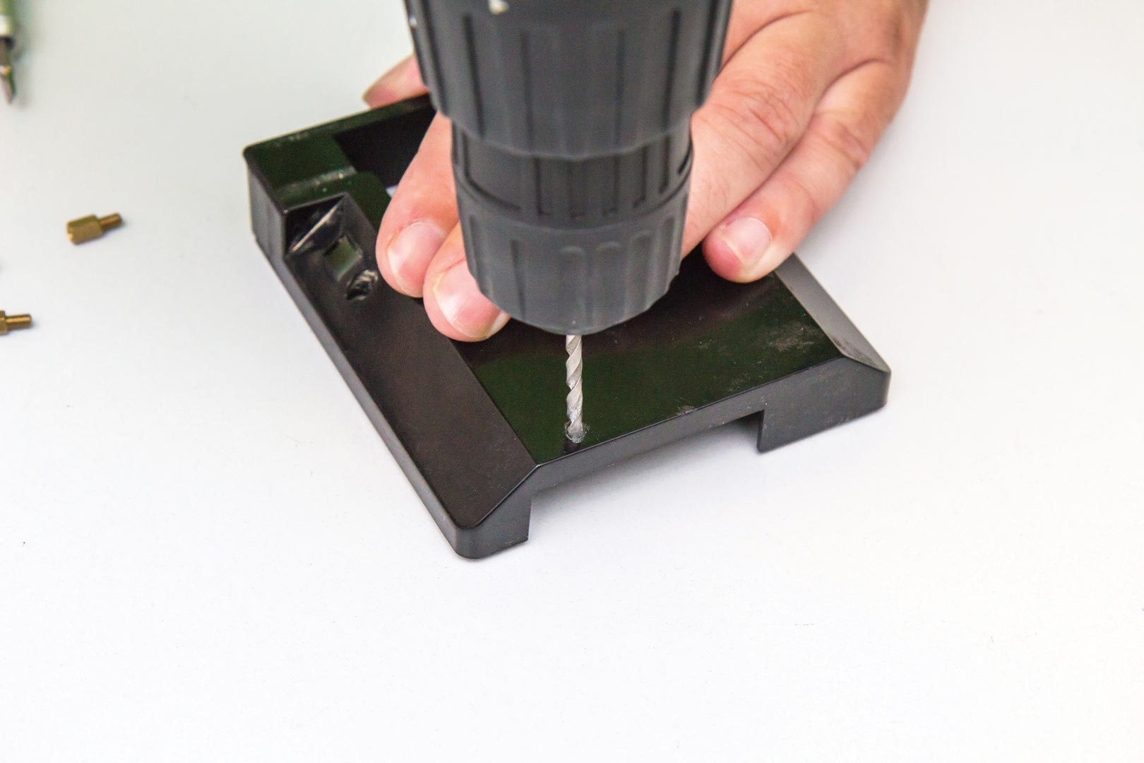 Prvi korak je pronaći mjesto na koje ćemo pričvrstiti Arduino i driver za auto. Kada ste pronašli mjesto, trebate izbušiti rupe kako bi mogli zašarafiti Arduino i driver. Najbolje je običnom olovkom kroz rupe Arduina, a zatim i drivera, zacrtati dvije oznake na kojima nam treba rupa za šarafe. Nakon bušenja, na te rupe prišarafit ćemo matice koje su nam ostale od starog kućišta računala, a koje su služile kao distanceri za montiranje matične ploče.