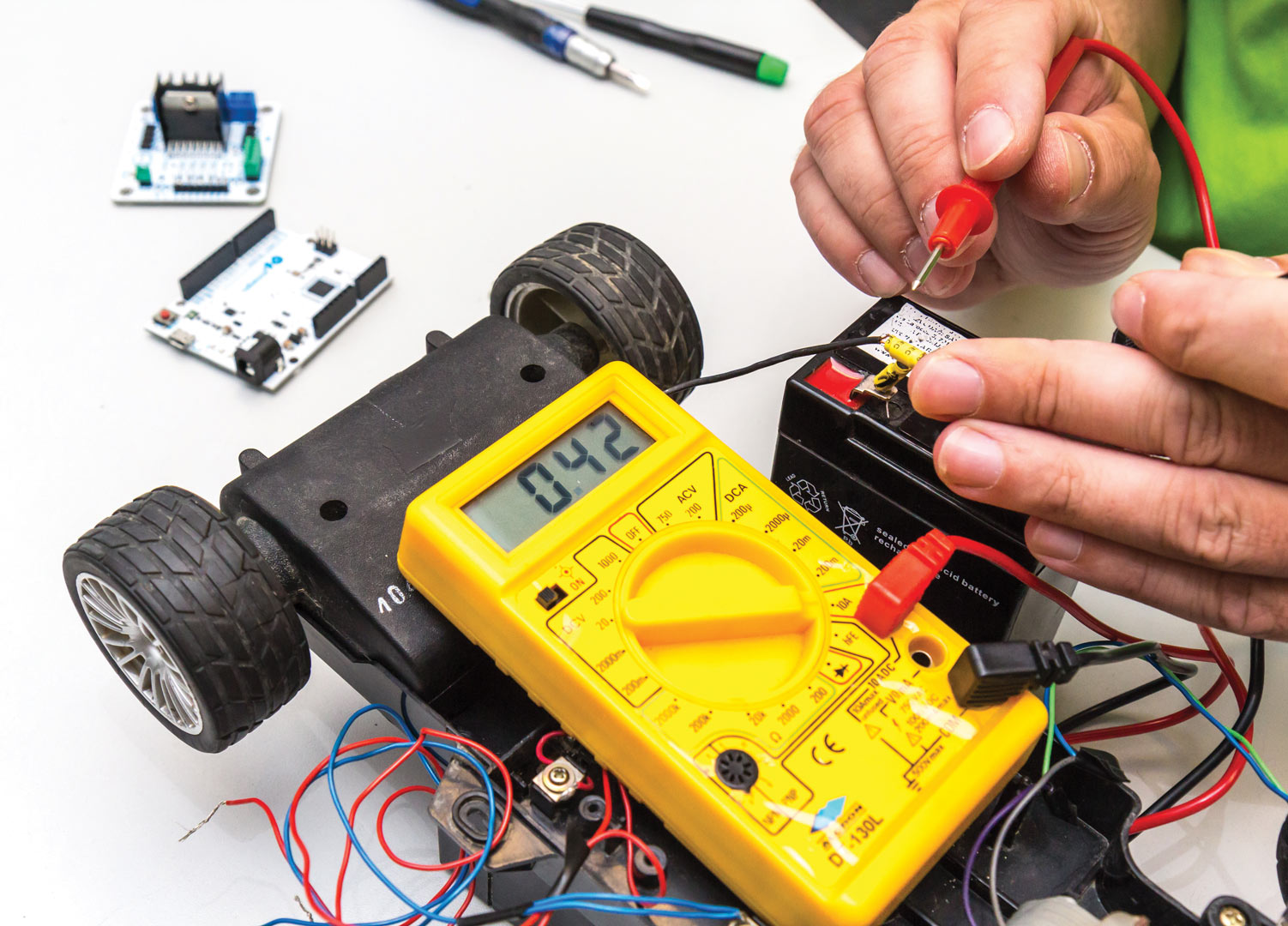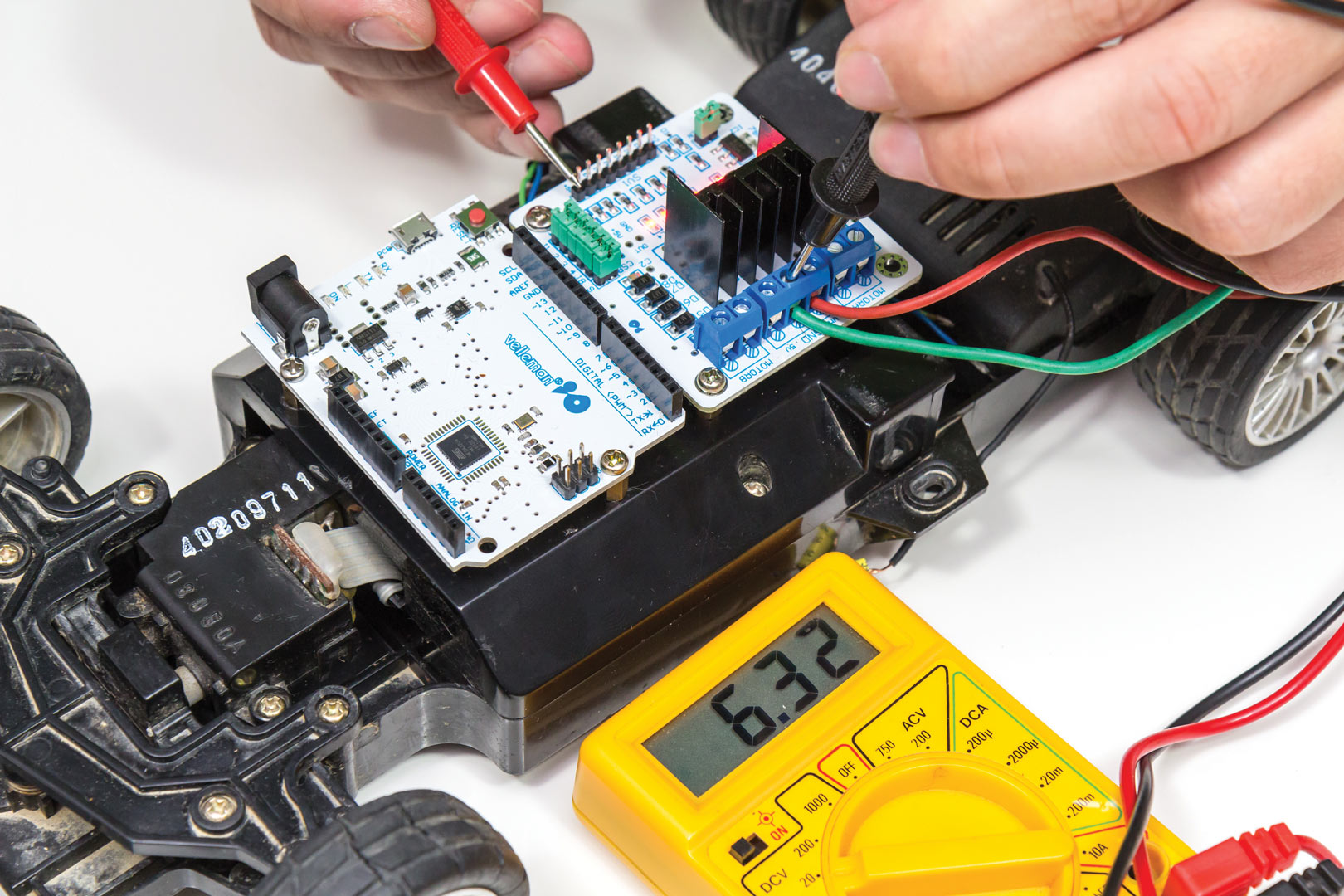 L298N radi na naponima od +5 do +35 V, a prema svakom od dva DC motora može isporučiti 2 A struje. Koliko je struje potrebno motorima koje vi imate možete izmjeriti multimetrom tako da ga postavite u mod za mjerenje snage te jednu žicu od baterije spojite s jednom motora, a drugu žicu od baterije spojite s jednom žicom mulitimetra, dok drugu žicu multimetra spojite s drugom žicom motora. Sada bi multimetar trebao pokazivati koliko ampera motor troši.