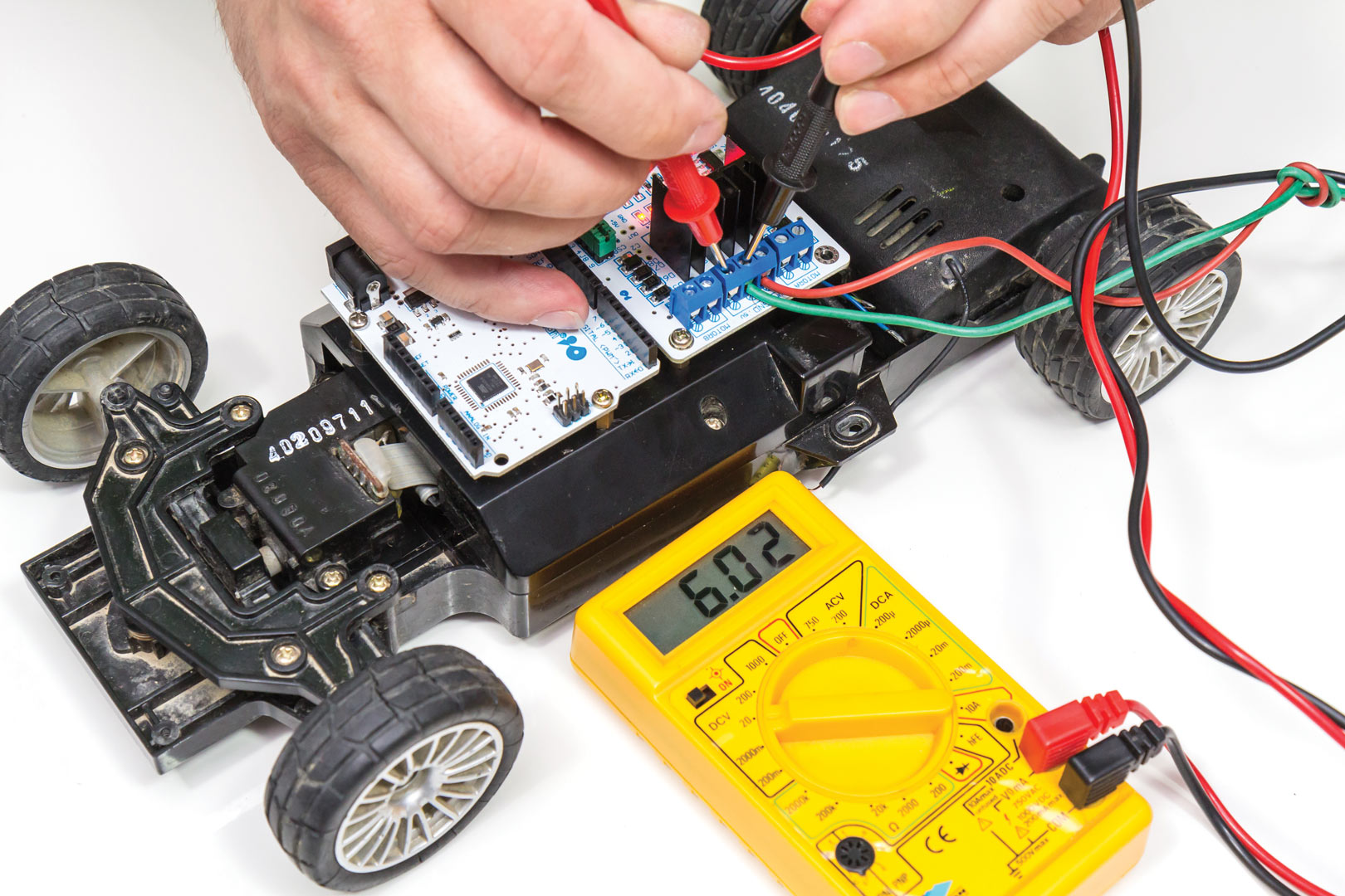 Mi smo tako iskoristili autić koji je prestao funkcionirati nakon pada u blato, nakon čega mu je otkazala elektronika. Bitno je samo da postojeći motori rade. To se lako može isprobati tako da ih direktno spojite na odgovarajuću bateriju. Ukoliko je automobil koristio bateriju od 9 V, tada motor spojite direktno na bateriju od 9 V kako ga recimo, spajanjem na bateriju od 12 V ne biste oštetili. U našem slučaju to je bila baterija od 6 V. Nije važno kako ste okrenuli plus i minus u odnosu na motor jer u jednom slučaju motor se vrti u jednu stranu, a nakon zamjene polariteta spajanja motor će se vrtiti u drugu stranu.
