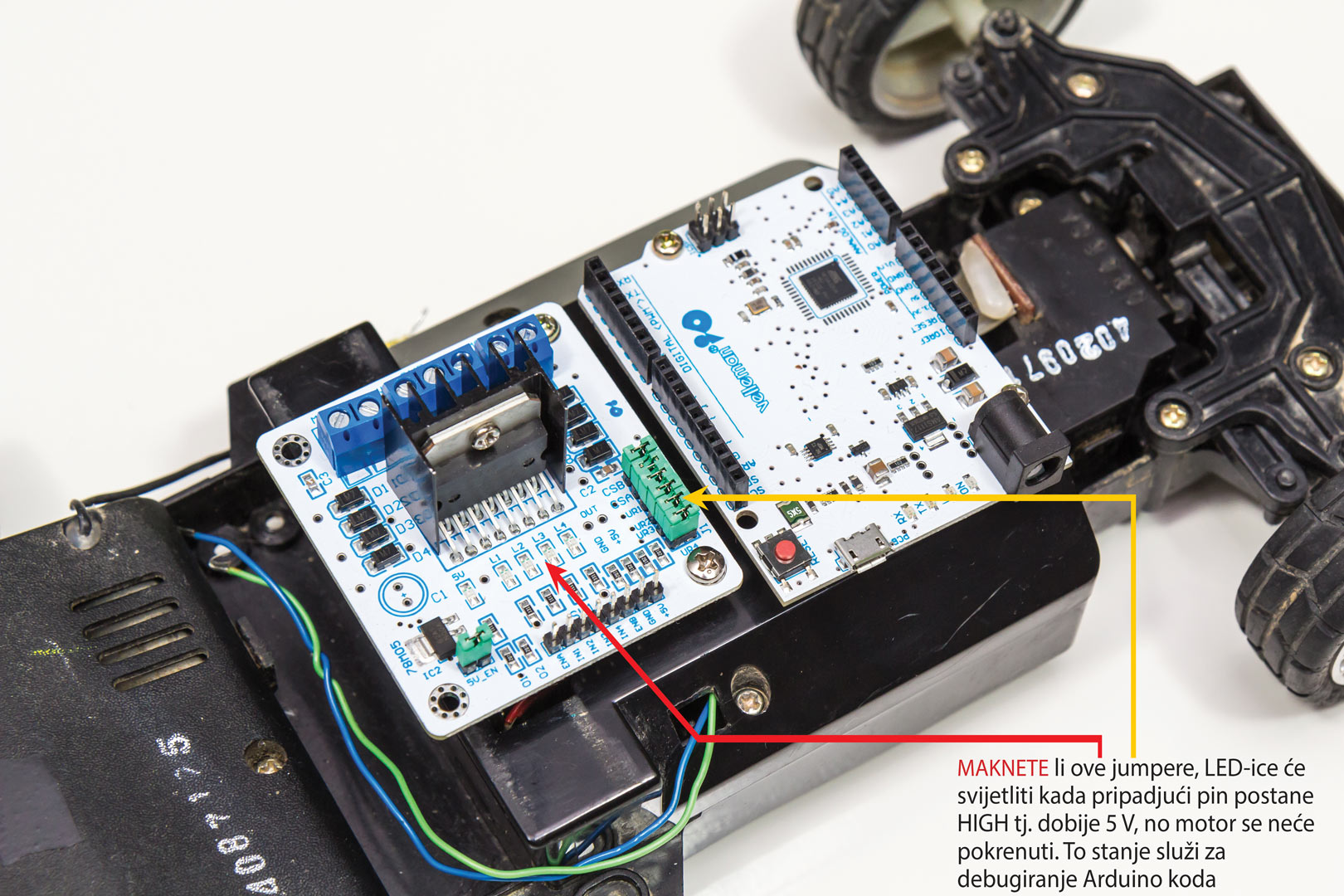 Kontrola brzine prvog motora mora biti spojena na PWM pin označen s ~