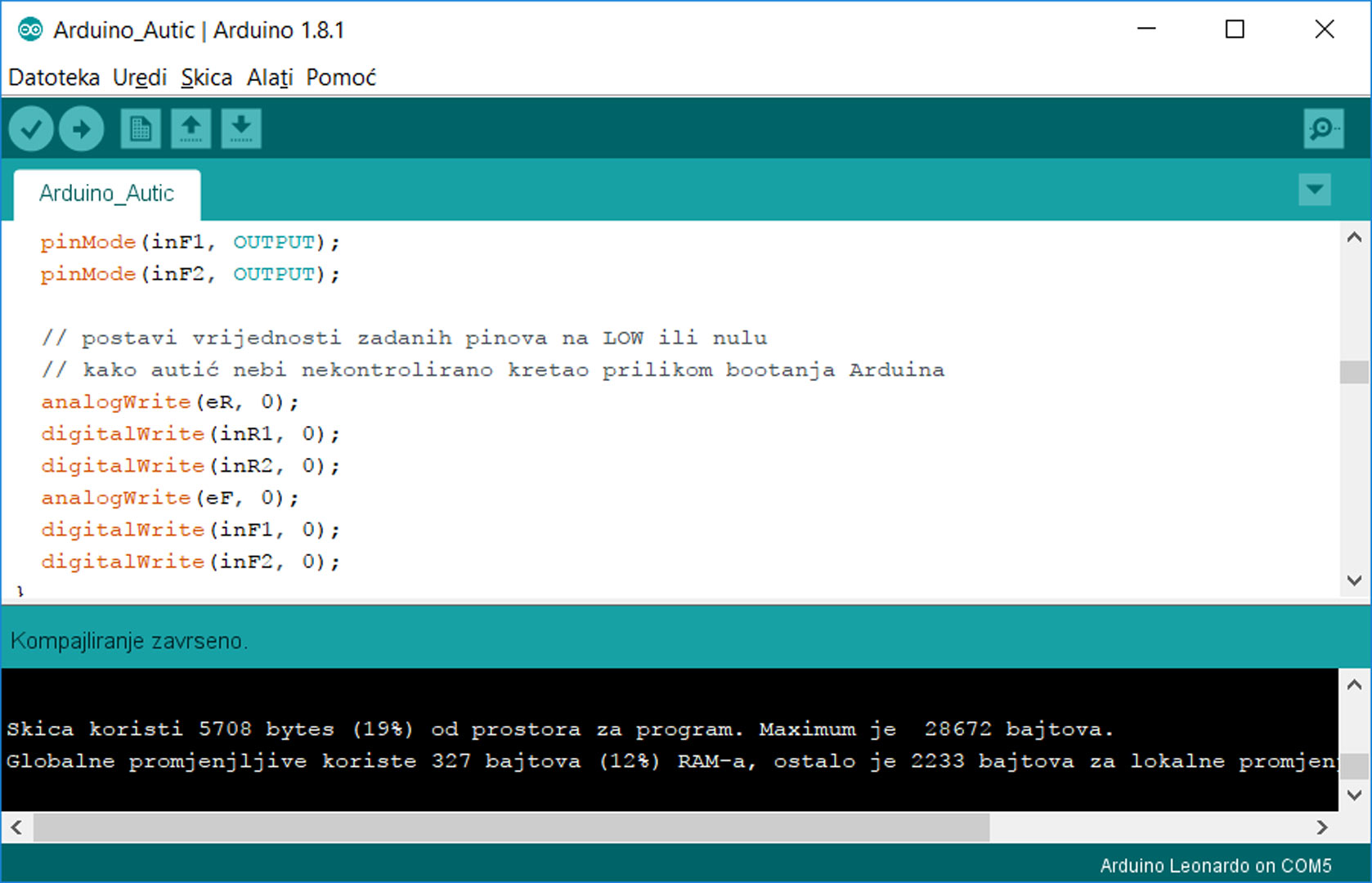 Dakle, prezuzmite kod s našeg GitHuba, na adresi https://github.com/VidiLAB-com te pronađite Arduino_Autic.ino kod ili direktno na linku http://bit.ly/arduinoautic. Uploadajte ga na Arduino. Kod smo dobro iskomentirali tako da neće biti problema s modifikacijom za koju itekako ima prostora.