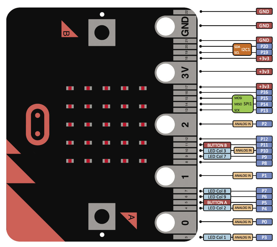 pinovi 19 i 20: zaduženi su za clock signal (SCL) i data line (SDA) za I2C komunikacijski protokol. Korištenjem I2C protokola više različitih uređaja može biti spojeno na istu sabirnicu zbog komunikacije s procesorom. Na primjer, akcelerometar i kompas iz samog BBC kompleta upravo na takav način komuniciraju s procesorom.