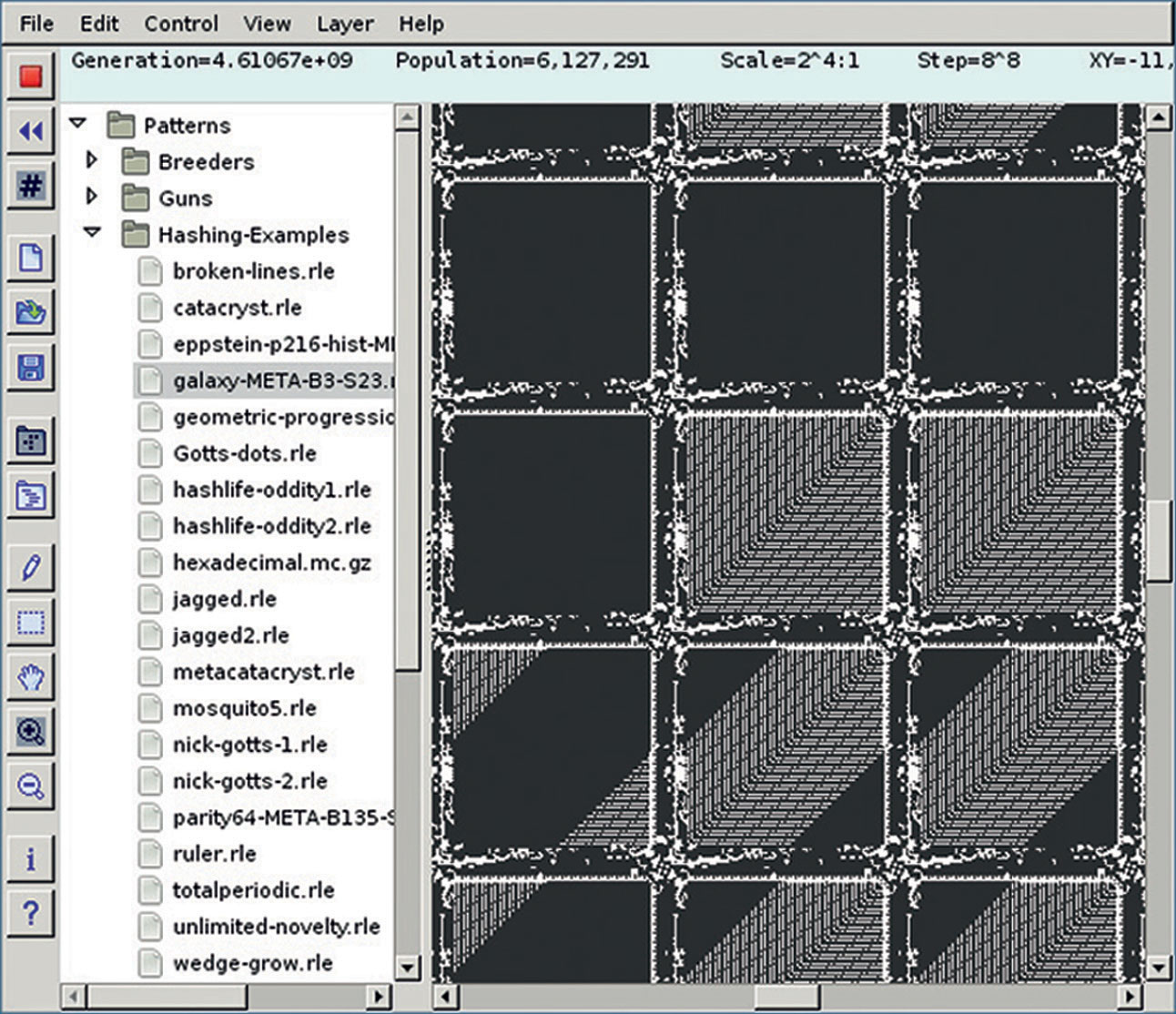 Na slici vidimo strukture koje su nastale iz ranije opisanih oblika, a ispuna tih pravokutnih oblika nastaje s mnogo „glider“ oblika pa su neki pravokutnici ispunjeni u potpunosti tim gliderima što bi označavalo živu ćeliju, dok drugi nisu ispunjeni te označavaju mrtvu ćeliju. Ovi napola ispunjeni su ili u nastajanju ili umiru. Sve se odvija u skladu s pravilima koja poštuju „Game of Life“ pravila.