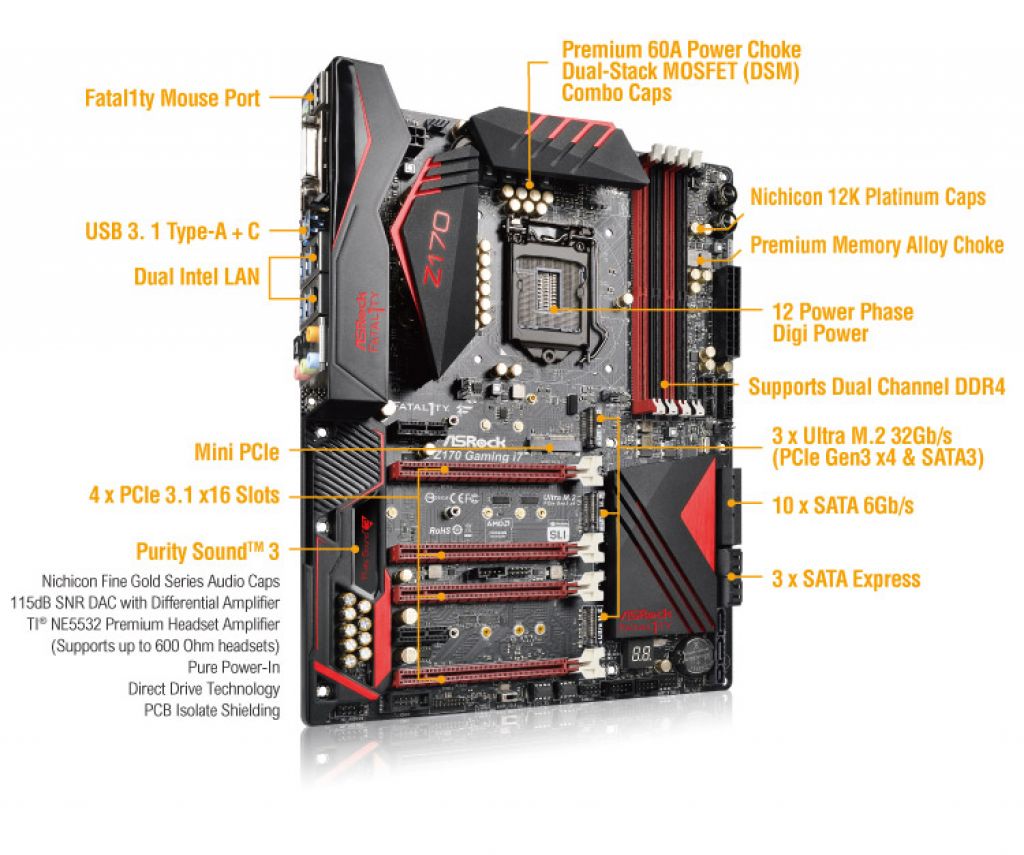 Fatal1ty Z170 Professional Gaming i7 dolazi s 10 portova za SATA 3 sučelje, te po tri za SATA Express te po tri za Ultra M.2. Od PCI portova prisutna su četiri PCIe 3.0 x16, po jedan za PCIe 3.0 x1 i PCIe 2.0 x1 te Mini-PCIe.