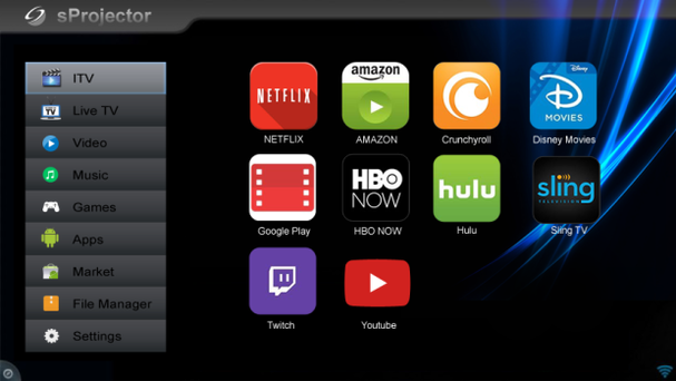 sProjector dolazi i s TV Dongleom, podrškom za DVB-T, DVB-T2, ISDB-T i ATSC (korištenje kao pokretni TV tuner), dok se TV program može snimati na SD karticu. Sučelje uređaja je Android 5.1 Lollipop, te nudi i Wi-Fi i Bluetooth 4.0 povezivost, čime se daje mogućnost korištenja i kao Android računalo.