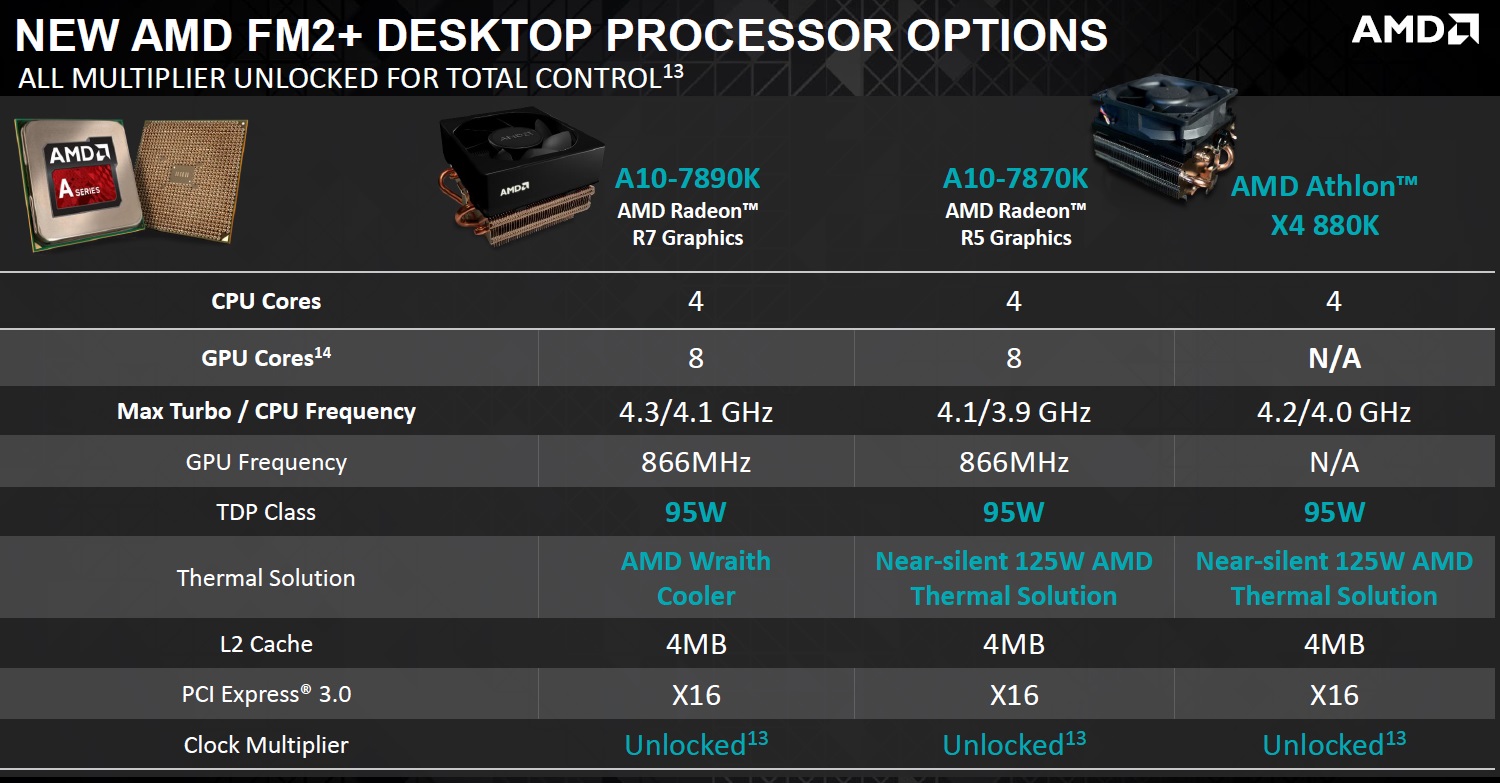 Kompanija je tako predstavila tri nova proizvoda koja će dolaziti i s njihovim novim stock CPU hladnjakom. Prvi procesor je četverojezgreni Kaveri APU (označava i ugrađenu grafiku) A10 7890K, koji dolazi s 512 grafičkih jezgri procesora, 4MB L2 cachea i 95W TDP (maksimalna količina topline koju stvara CPU a koju sustav hlađenja mora raspršiti u tipičnom radu). Radi na 4,1 Ghz radnom taktu i 4,3 Ghz u boost načinu, čime je postao najbrži Kaveri APU. Dolazi u bundleu s novim AMD-ovim Wraith CPU hladnjakom. Za potrebe overclockinga sadrži otključanu opciju množitelja.