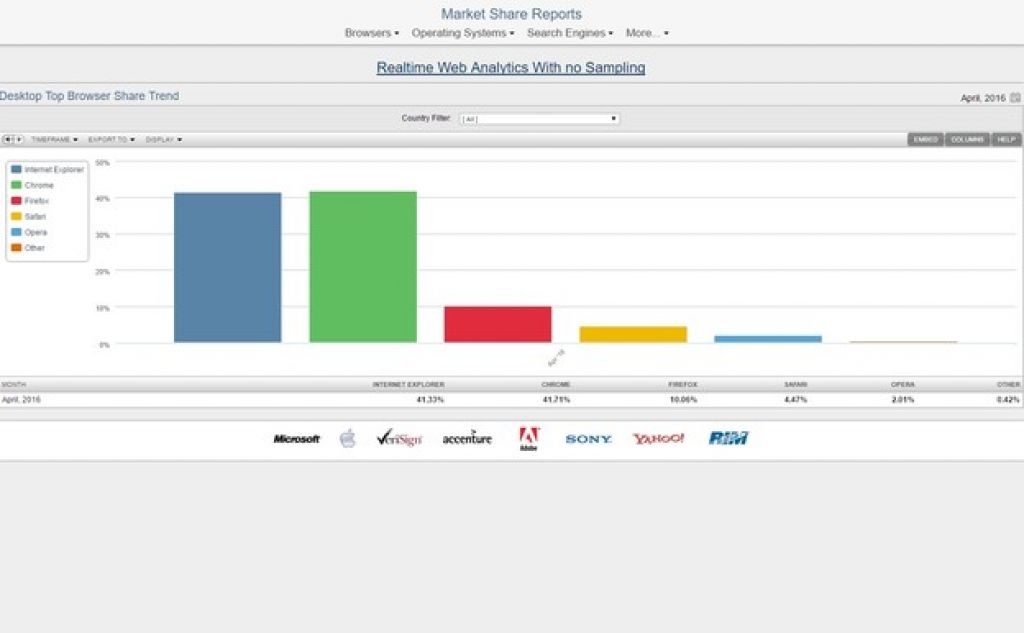 Prema najnovijem izvještaju za travanj 2016. Chrome je sa 41,71% udjela upravo prestigao IE koji je pao na 41,3%, te će u sljedećim mjesecima vjerojatno i dalje padati. Googleov preglednik tako će uskoro suvereno vladati na tržištu preglednika, te ga neće moći ugroziti ni ostala konkurencija poput Mozillinog Firefoxa, koji se u ovom trenutku ima 10,06% udjela. Ostali preglednici poput Safaria imaju 4,47%, dok je Opera na 2,01%.