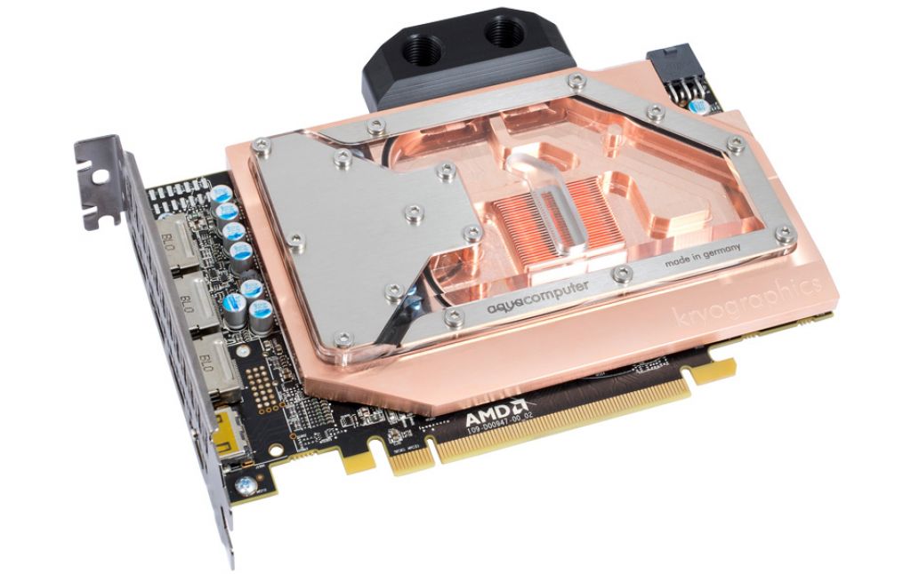 Kompanija Aqua Computer objavila je dostupnost kryographics RX 480 vodenog bloka proizvedenog u njihovim potrojenjima u Njemačkoj. Kao i njihov nedavni kryographics za Pascal arhitekturu (GTX 1000 serija kartica), tako i ovaj ima mikrostrukturu s jet plateom. Baza je napravljena od elektrolitičkog bakra s debljinom od 10 mm. Zahvaljujući preciznoj proizvodnji dopušteno je korištenje termalne paste ne samo za GPU, već i za RAM, što prema navodima kompanije osigurava najbolju vezu između grafičke kartice i coolera. Područje iznad GPU-a sadrži jet plate koji usmjerava vodu u dva pravca kroz svoje mikro strukture. Uključena je i termalna podloga za regulatore napona. Instalacija je jednostavna i sigurna putem izrađenih poniklanih umetaka. Za najbolji mogući prijenos topline kompanija je sve relevantne kontaktne površine i ispolirala.