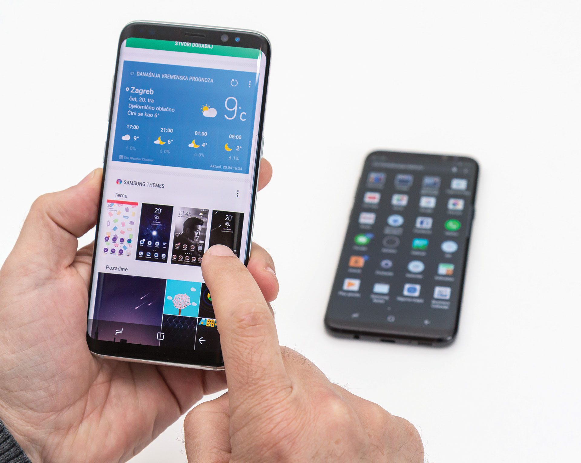 Nema više ravnog ekrana nego su oba modela sa zakrivljenim ekranima na kojima se prikazuju razni Edge widgeti kakve viđamo već nekoliko godina. Dakle, to na prvu nije novost, ali je ipak novost jer (više) nema modela s flat ekranom u flagship kategoriji. Iako vam se čini da se nema gdje primiti telefon, u stvarnosti nema dodira s ekranom dok se telefon pridržava u ruci. I zgodno je što se i veliki S8+ može koristiti vrlo ugodno, iako se ne može s jednom rukom dohvatiti vrh ekrana. Očekivano, straga smješteni senzor otiska prsta je previsoko postavljen, ali samo ako ne koristite telefon na ispravan način - pridržavanjem u sredini. Tako da se lako dolazi do senzora otiska prsta, ali vjerojatno i do leće stražnje kamere koja će tako uvijek biti zaprljana. Na Note7 smo po prvi put koristili senzor šarenice oka i bili oduševljeni, a isto smo postavili i na nove Galaxy osmice - otključavanje je trenutno, u tren oka te je najpraktičnije, iako dobro radi i prepoznavanje lica. Izbor načina otključavanja je zaista bogat. Ako vas zanima, zadržan je 3,5 mm ulaz smješten na dnu telefona, pored USB Type-C ulaza.