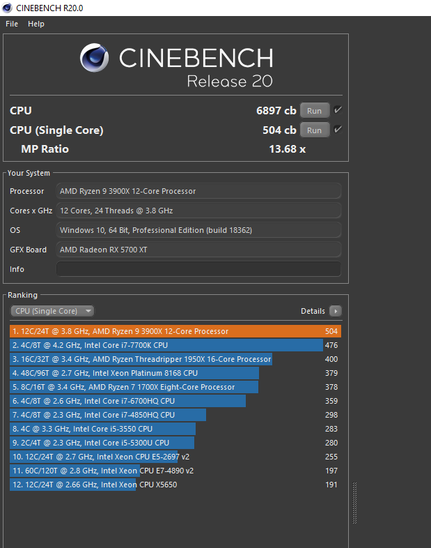 Novi Cinebench R20 nedavno je izašao te mu je glavna prednost veća testna slika za koju novim superbrzim procesorima ipak treba dulje vremena kako bi se rezultati jasnije razlikovali. Kada se testira jedna jezgra, dobije se 504 boda, dok sve jezgre zajedno postižu 6897 bodova u standardnom načinu rada.