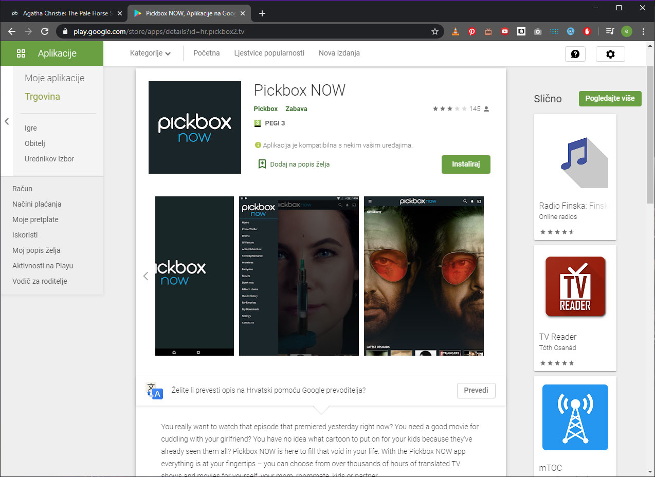 Osim putem gore navedenog linka, Pickbox je moguće instalirati i na Android uređaje putem linka iz Google Play Storea https://play.google.com/store/apps/details?id=hr.pickbox2.tv.