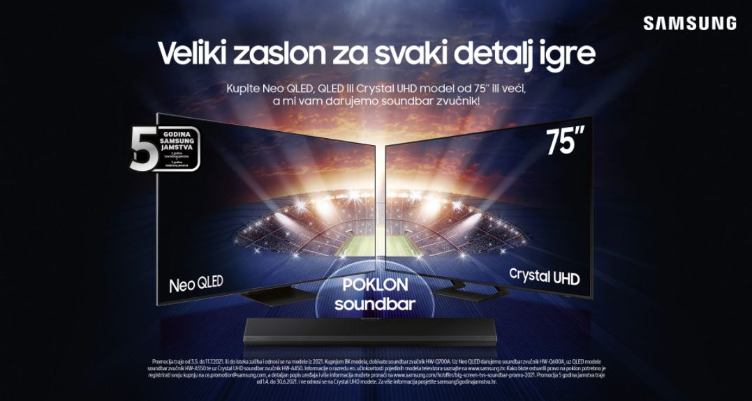 A lijepa vijest je da Samsung, uoči velikog nogometnog natjecanja, ima akciju na velike 75’’ i 85’’ zaslone, koja traje sve do 11. Lipnja 2021, kao i promotivnu ponudu za ostvarivanje 5 godina jamstva. Uz nove Neo QLED i Crystal UHD televizore na poklon se dobivate i soundbar zvučnik nakon registracije kupovine na Ova e-mail adresa je zaštićena od spambota. Potrebno je omogućiti JavaScript da je vidite..