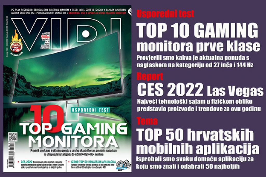 U novom broju časopisa VIDI br. 311 za veljaču 2022. godine donosimo vam veliki test gaming monitora velikih dijagonala i frekvencija osvježavanja na kojima vam čudovišta, oružja i projektili nikada neće treperiti, a među posebno zanimljivim temama izdvajamo i naš tradicionalni izbor TOP 50 hrvatskih mobilnih aplikacija za ovu godinu, od kojih će se mnoge naći na vašim telefonima jer su korisne, pametne i jako dobro napravljene.