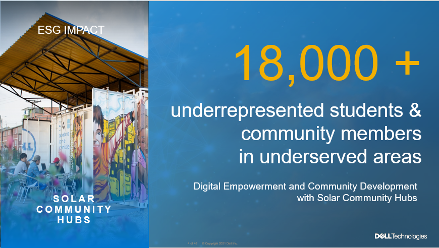 Već dugi niz godina Dell Technologies radi na projektu Solar Community Huba, gdje uz pomoć partnera gradi 25 središta na tri kontinenta. Ona su opremljena rješenjima kompanije, a u potpunosti se napajaju na solarni pogon. Prvo središte nastalo je u Boi Esperanci u Brazilu, a otvaraju se i u drugim mjestima u razvoju.