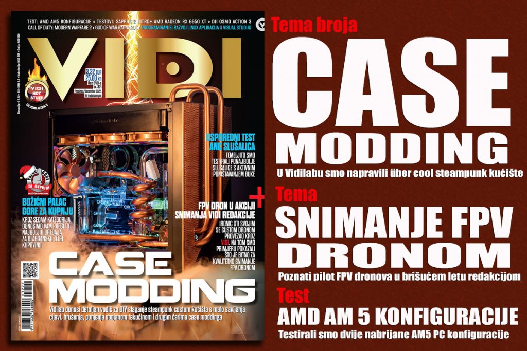 U novom broju časopisa VIDI br. 321 za prosinac pronaći ćete obilje prilično raznovrsnih sadržaja, među kojima su božićni palac gore za blagdansku kupnju hardvera podijeljenog u 7 kategorija, usporedni test slušalica s tehnologijom poništavanja buke, priča o entuzijastima letenja i snimanja FPV dronom na primjeru snimanja "one-take" videa u redakciji Vidija, usporedni test dviju AM5 PC konfiguracija te glavna tema broja, odnosno detaljna radionica za slaganje steampunk PC custom kućišta.