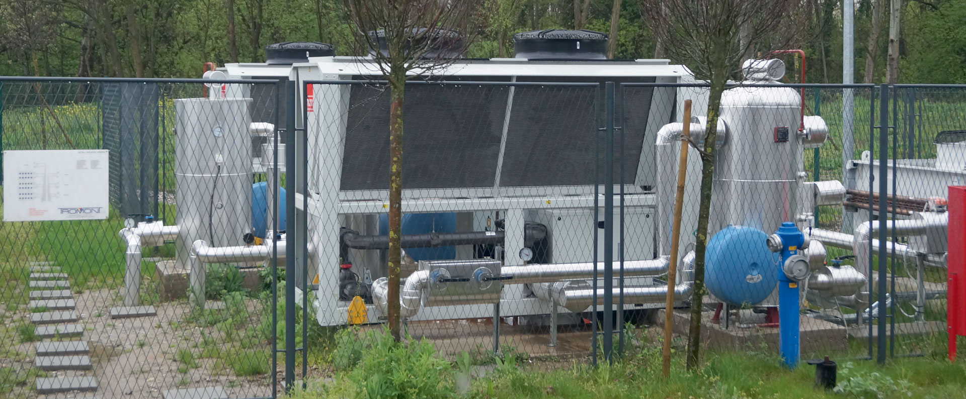 spajaju se u jednu veliku cijev koja rashladnu tekućinu odvodi do izmjenjivača topline koji toplinu prenosi u vanjski cjevovod kroz koji također struji rashladni medij (glikol se koristi kao rashladna tekućina da ne došlo do smrzavanja kada vanjska temperatura padne ispod 0°C). Vanjski cjevovod odvodi toplinu do ogromnih hladnjaka izvan zgrade, koji tekućinu cijelo vrijeme hlade na 25 °C.