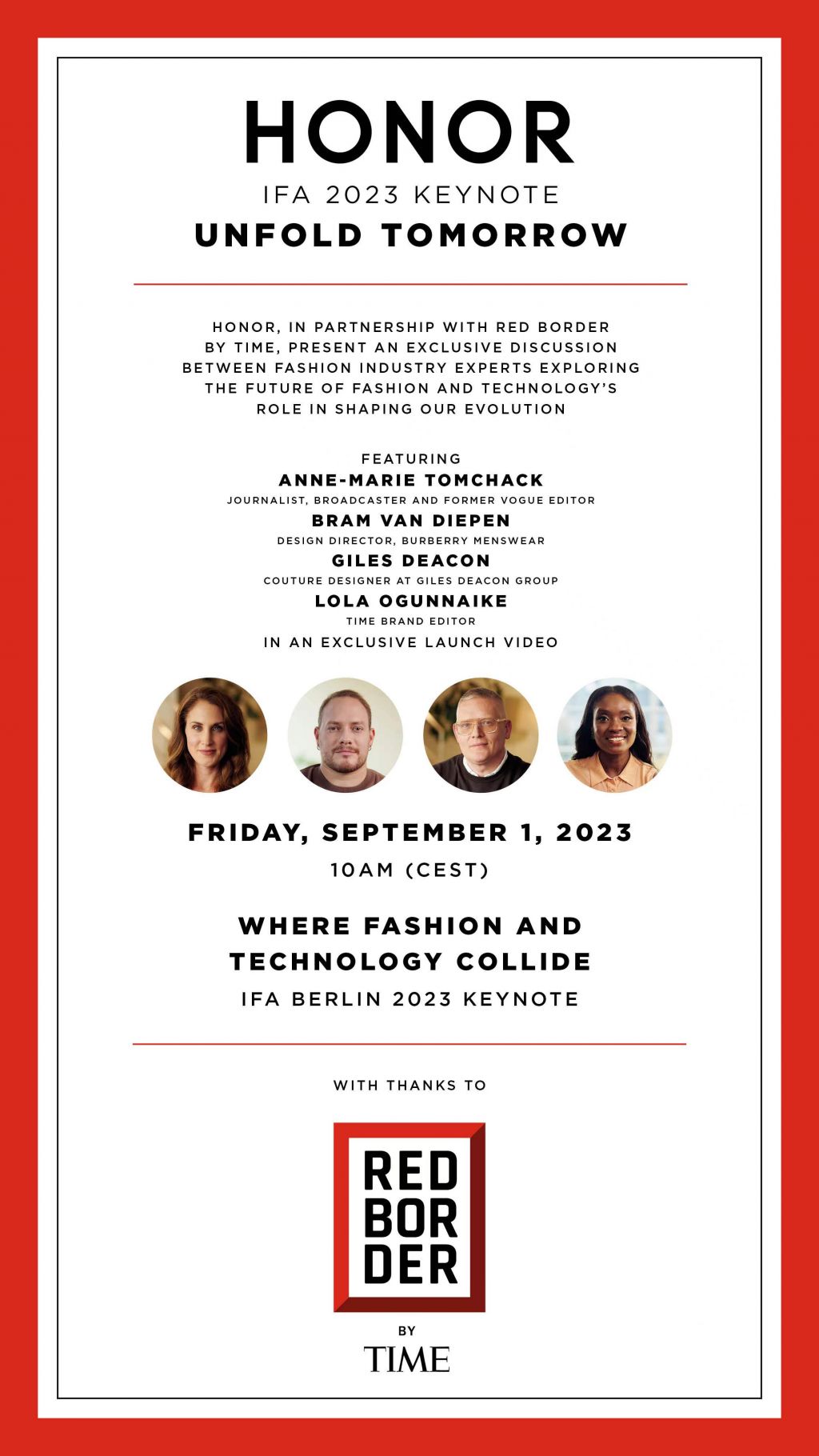 Ususret IFA-i 2023, koja počinje ovoga petka, HONOR najavljuje najnoviju suradnju s TIME 100 i poziva sve zainteresirane na raspravu TIME Lifestyle of Tomorrow. Kroz raspravu će se istražiti konvergencija tehnologije, mode, održivosti i životnog stila.
