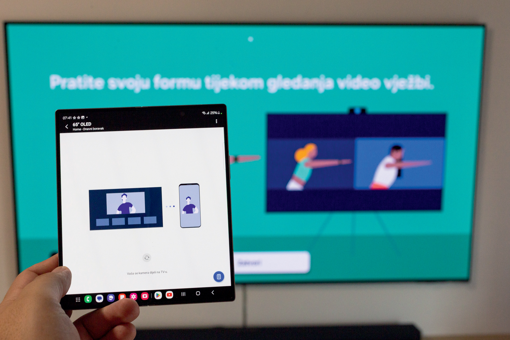 Kamera se dijeli direktno s televizorom, a Samsung vam tako, primjerice, omogućuje split-screen način gledanja sadržaja gdje je jedna strana vaša kamera mobitela, a druga YouTube s kojeg možete gledati razne vježbe. Korištenje kamere mobitela tako vam omogućuje da uživo vidite i odmah usporedite pokrete kod vježbanja i njihovu ispravnost u odnosu na originalni video.
