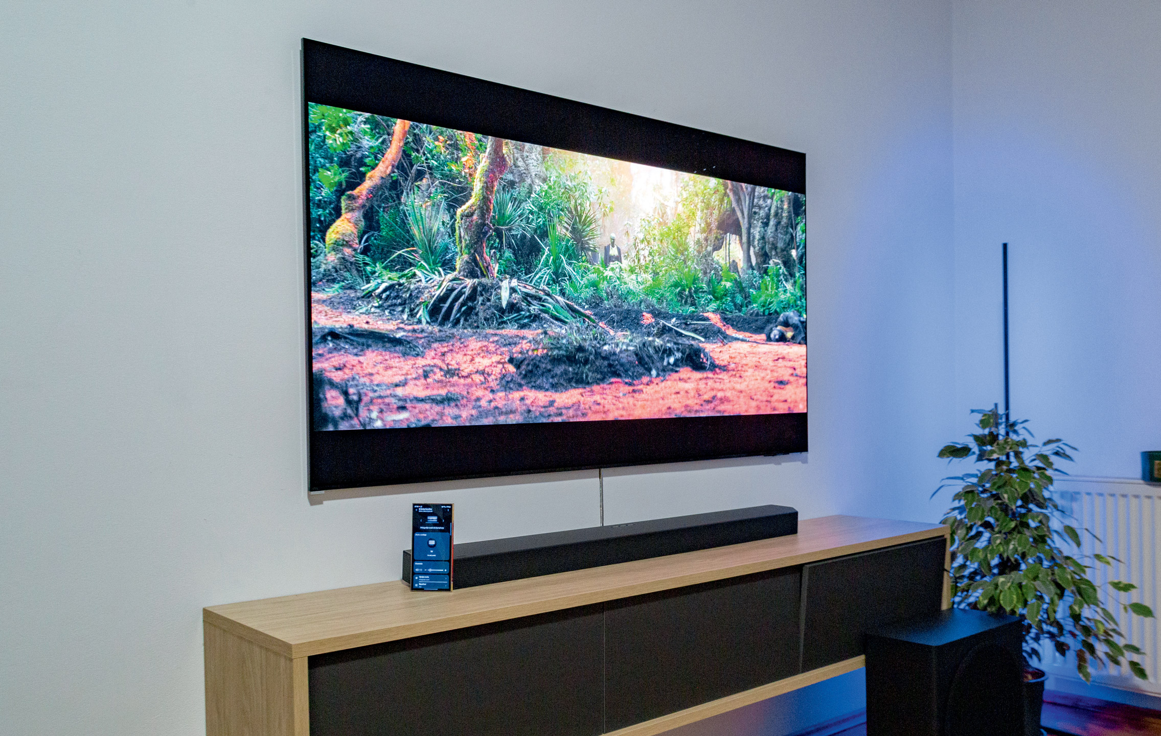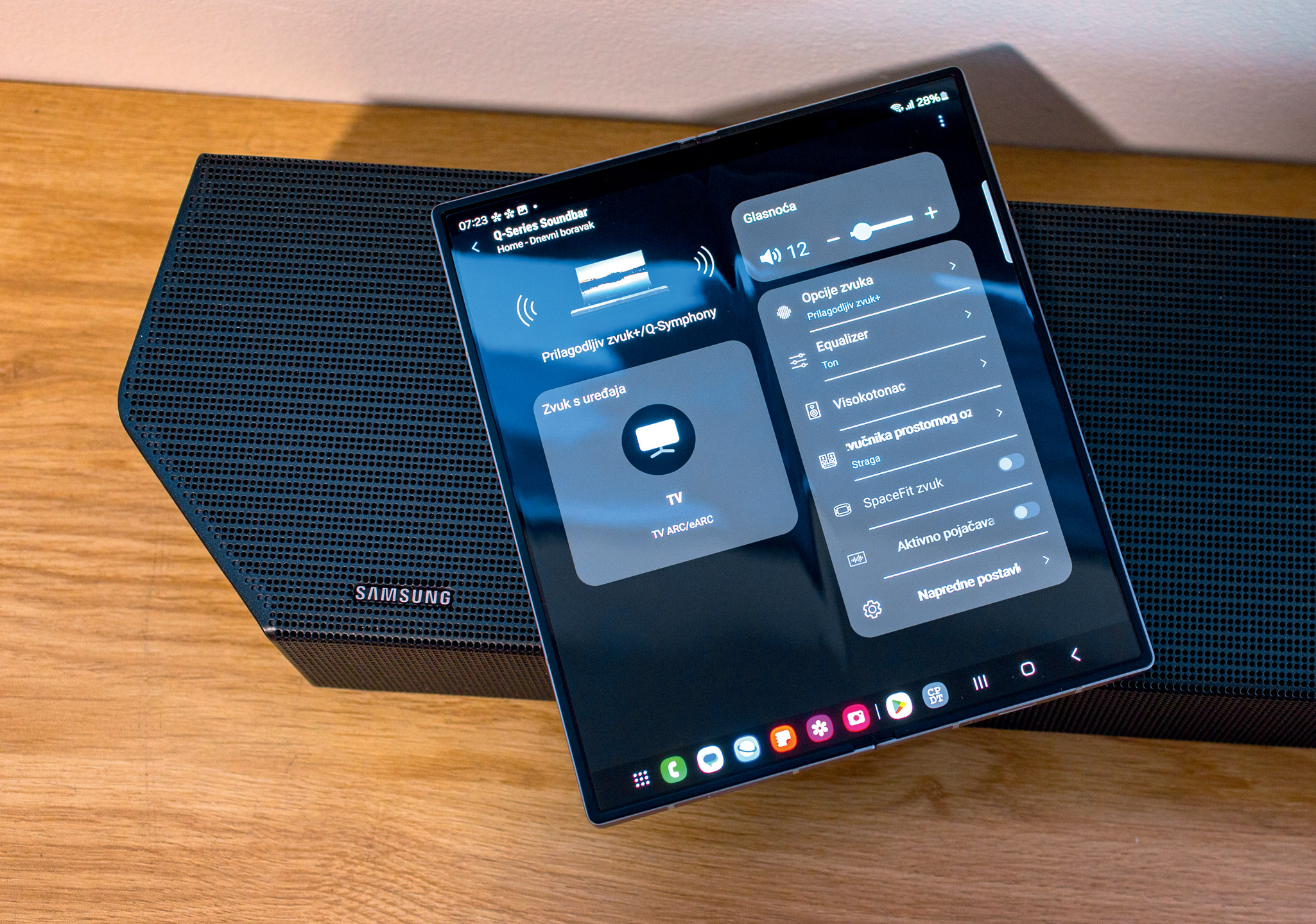 Ovdje u priču uskače i činjenica da Samsung nudi takozvani Q-Symphony sustav, kojim u reprodukciju zvuka soundbara dodaje i postojeće TV zvučnike, koji u slučaju ovog televizora dodaju oko 70 W snage ukupnom sustavu, a također pomažu u ispunjavanju prostornog efekta kod reprodukcije sadržaja s televizora.