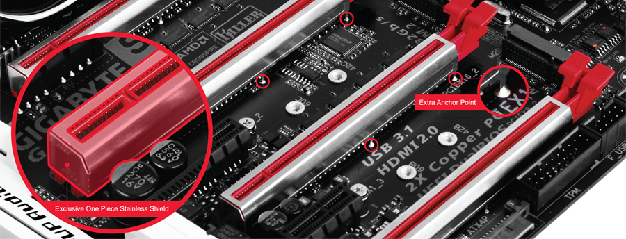 Iz samog imena matične ploče ATX formata vidi se kako ima i podršku za SLI i CrossFire, omogućujući ugradnju dvije grafičke kartice. Gigabyteov PCIe Shield ojačava PCIe konektor kako bi pružio dodatnu snagu za prihvaćanjem težih grafičkih kartica.
