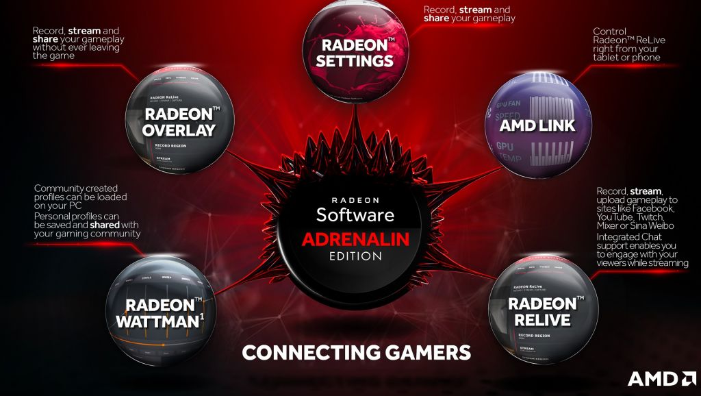 Enhanced Sync sada bolje kontrolira framerate za Vulkan API, konfiguracije s više kartica ili više monitora. Radeon Overlay se pokreće kombinacijom Alt + R tipki te vam nudi prilagodbu nekih opcija grafičke kartice bez izlaska iz prozora same igre. AMD link je također vrlo zanimljivo rješenje jer omogućuje upravljanje postavkama putem aplikacije na vašem pametnom telefonu.