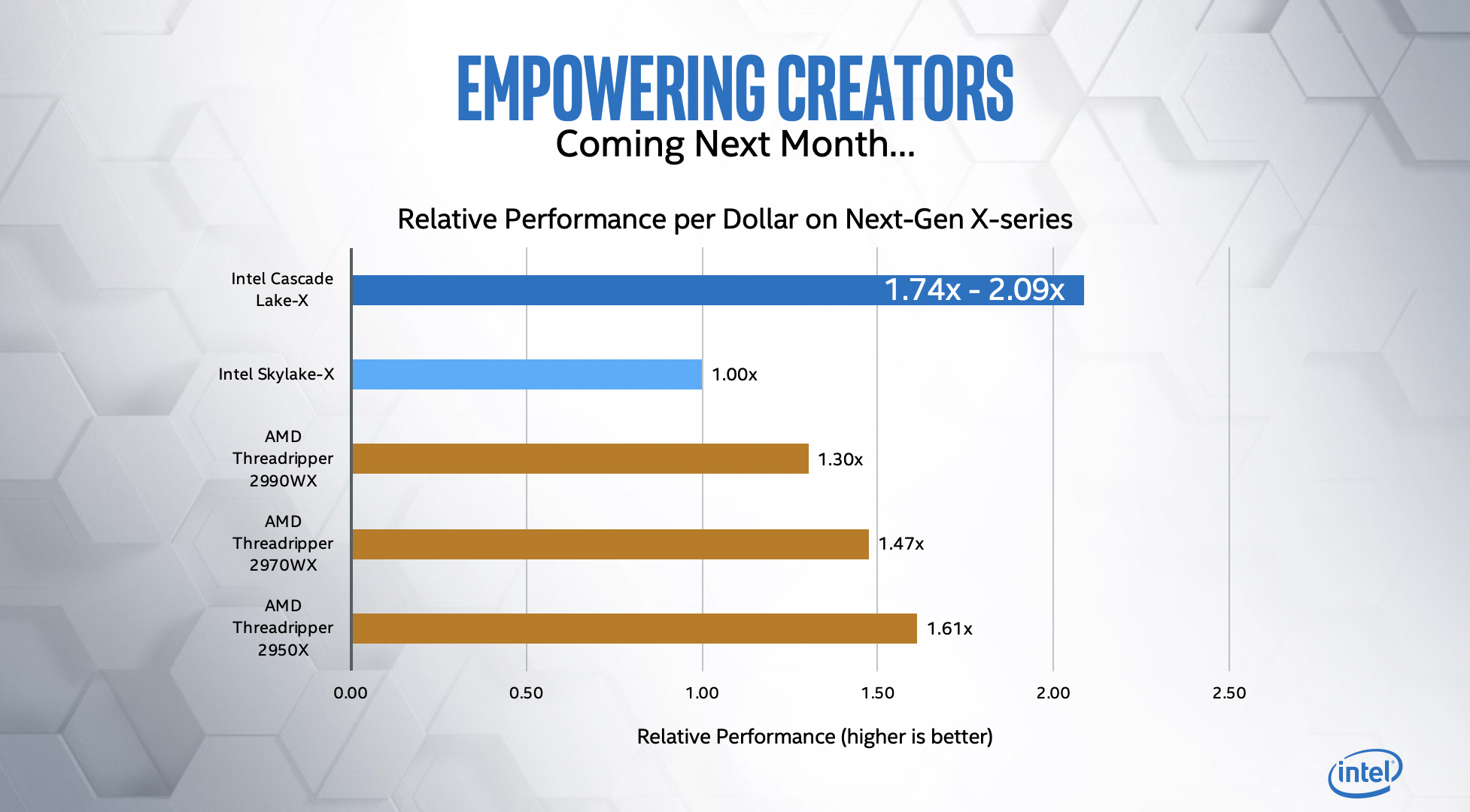 Intel je najavio i da će novi Cascade Lake-X procesori imati bolji omjer cijene i performansi u usporedbi sa AMD Threadripper 2000 serijom, što znači vrlo agresivne cijene procesora od strane Intela.