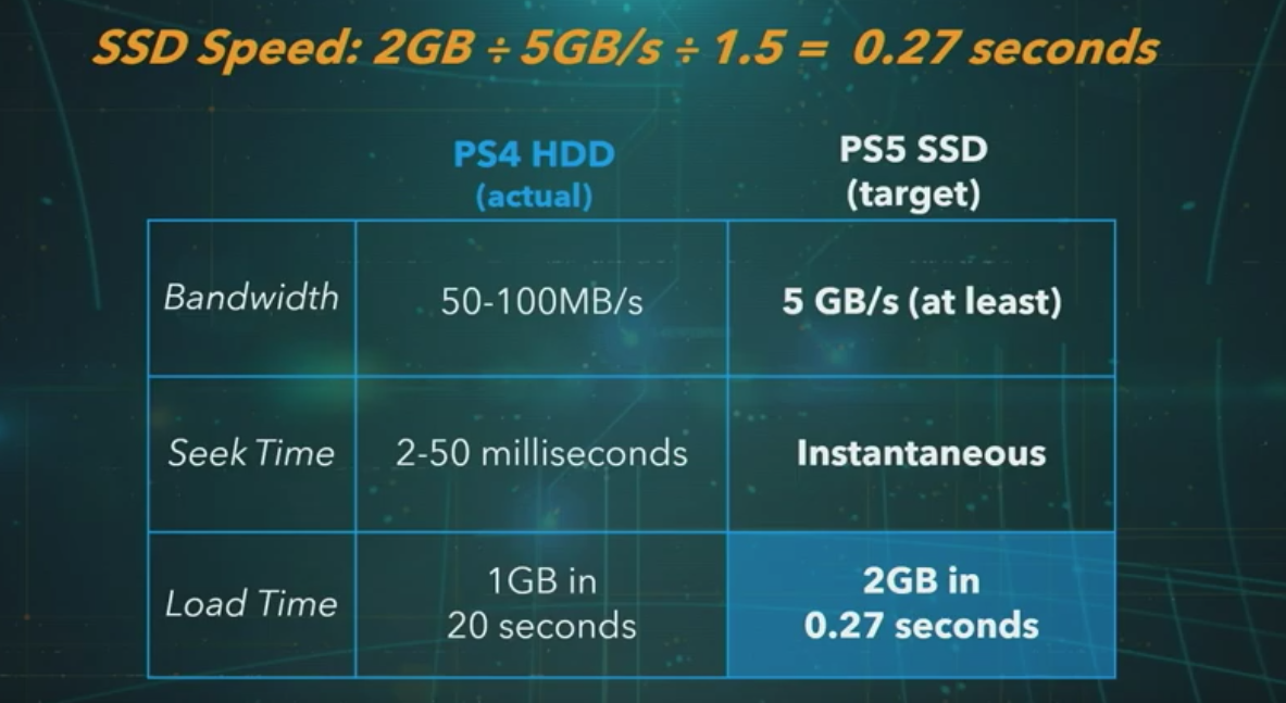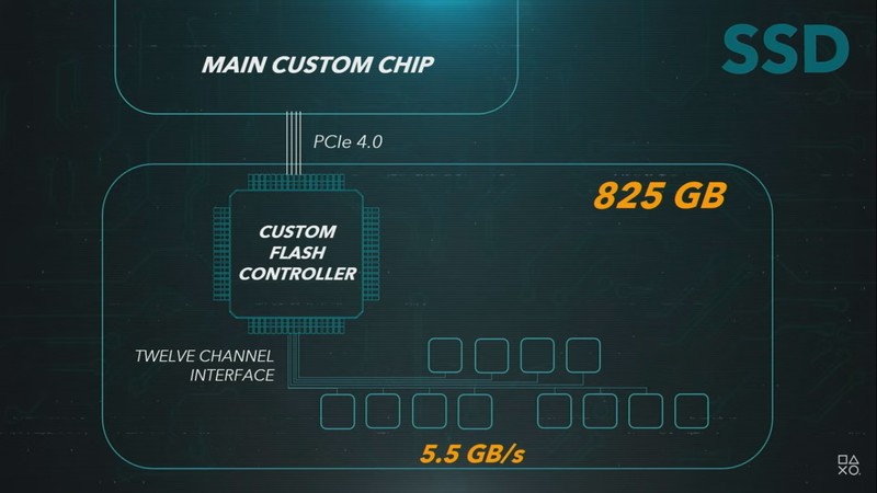 Za pohranu PS5 imati će 825 GB SSD. No, brzina ovog diska brža je i od najbolje ponude u PC svijetu sa 5,5 GB/s raw podataka ili 8-9 GB/s kompresiranih podataka. Igre se tako mogu učitati u svega nekoliko sekundi.