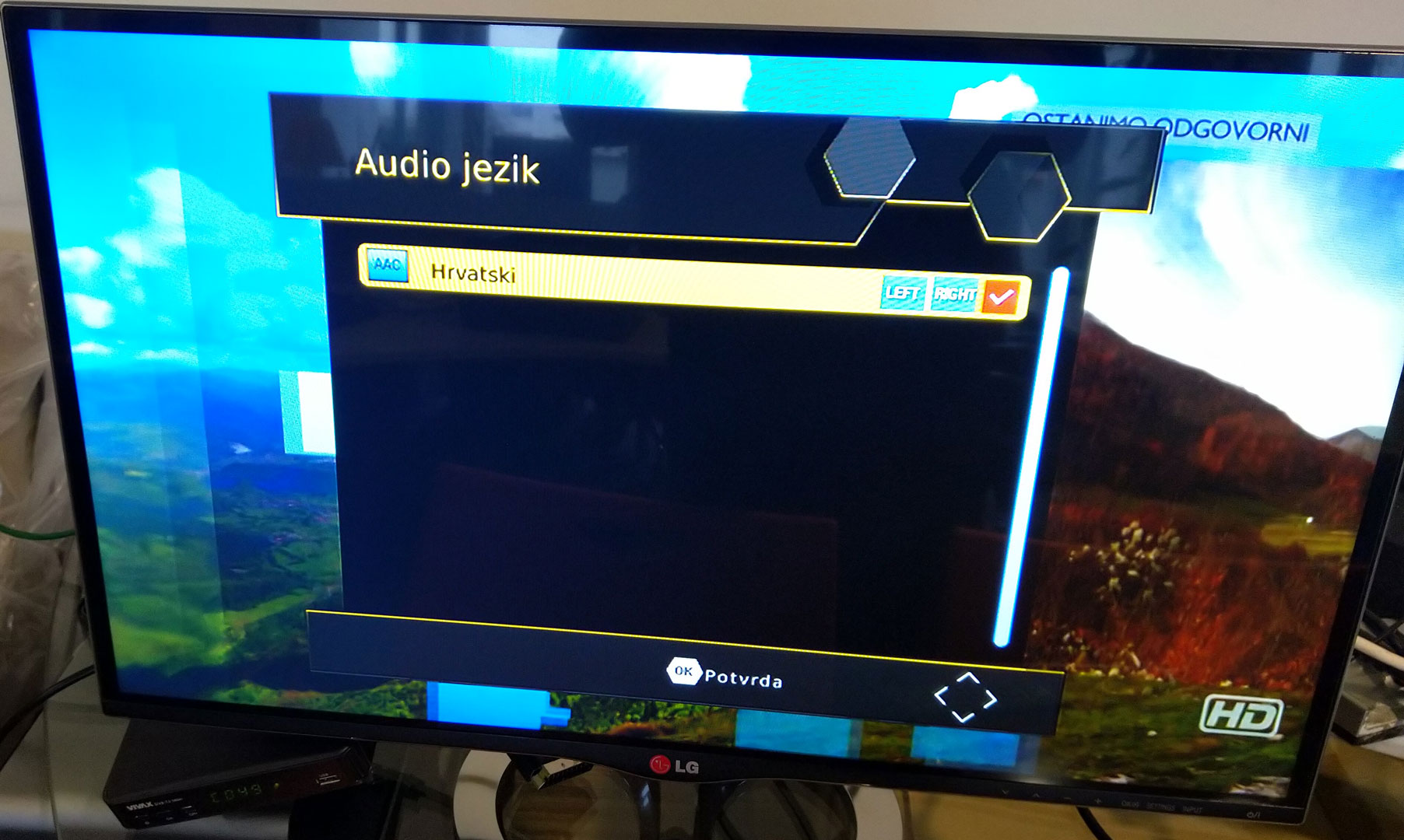 Dakle, pokušavamo promijeniti izvor zvuka pritiskom na tipku „LANG“ i uviđamo kako kanal koji nema zvuk posjeduje AAC kodek zvuka. Prebacujemo na neki drugi program koji je imao zvuk i pritiskom iste tipko otkrivamo kako je na tom kanalu riječ o MPEG audio kodeku.